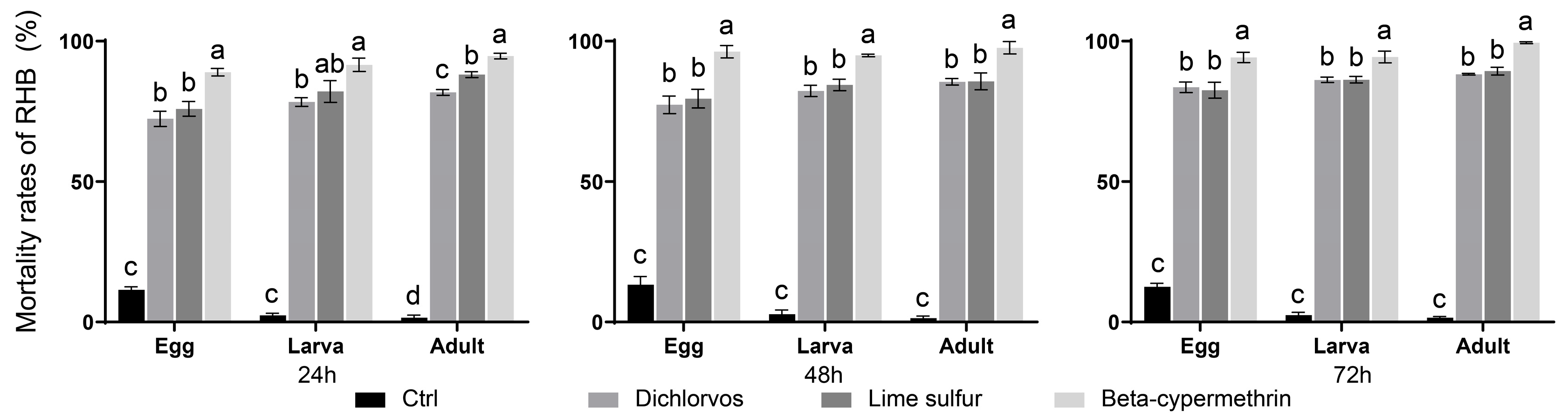 3.1. Fumigation Toxicity of AP and SF Against Various Developmental Stages of RHB
