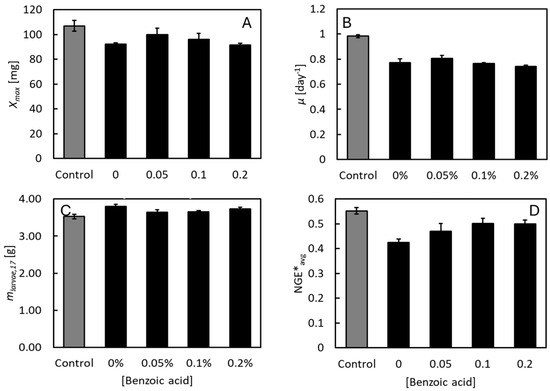 APA StyleChristiansen, T. B., & Eriksen, N. T. (2025). Effects of Low Benzoic Acid Concentrations on Growth and Substrate Utilization in Black Soldier Fly Larvae. Insects, 16(11), 1155. https://doi.org/10.3390/insects16111155