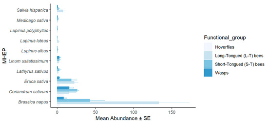 In small fields, 53% of the hoverfly specimens were attracted to coriander, 25% to canola, and 22% to arugula. The long-tongued bees demonstrated a clear preference for canola, with 78% of the specimens recorded, followed by arugula with 13% and coriander with 9%. Short-tongued bees were attracted to canola (49%), followed by coriander (30%) and arugula (21%). Similarly, wasps were attracted to coriander (59%), canola (31%), and flax (10%). The statistical analysis revealed a highly significant difference in the species richness of pollinators among the MHEPs (p < 0.001) (Figure 1). In large fields, the pollinators captured on canola comprised 50% of the specimens, while coriander also attracted 50% of the specimens. There was no significant difference between MHEPs in terms of species diversity (p > 0.05) (Figure 2).