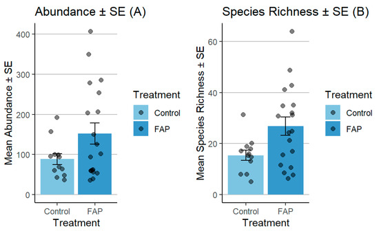 Figure 4. Comparison of pollinator abundance (A) and species richness (B) between FAP and control fields in large fields in 2021. There were significant differences between FAP and control fields in terms of flower visitor abundance (p < 0.001), and species richness (p < 0.05).