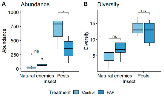 Figure 5. The abundance (A) and diversity (B) of natural enemies and pests of eight FAP (100% FAP field areas) and six control (100% control field areas) large fields. No significant differences in natural enemy abundance and diversity between FAP and control fields, but a significant difference in pest abundance in control fields (Emmeans). ns = not significant. Statistical analysis was performed by Emmeans tests, with asterisk indicating level of significance as follow: * p < 0.05.