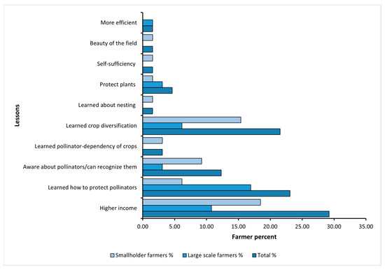 When asked about the lessons learned from FAP-trials (an open-ended question with multiple answers possible; see Figure 6), most of the farmers reported that they had discovered how to increase their income through FAP planting designs. Additionally, some learned about the role of protecting pollinators in their fields; 22% gained insights about crop diversification; some became more aware of pollinators and their importance, and some acquired knowledge about safeguarding plants.
