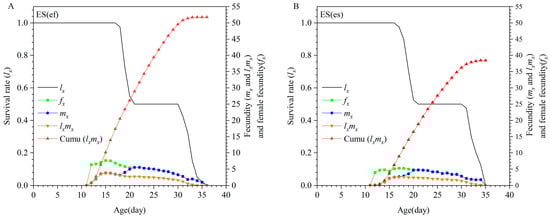 Age-specific survival rate (lx), female fecundity (fx), age-specific fecundity (mx), and age-specific net maternity (lxmx) of ES(ef) population (A) and ES(es) population (B).