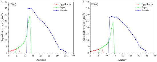 Reproductive value (vxj) of ES(ef) population (A) and ES(es) population (B).