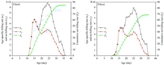 Age-specific whitefly-killing rate (ux), age-specific net killing rate (wx), and cumulative killing rate (Zx) of ES(ef) population (A) and ES(es) population (B).