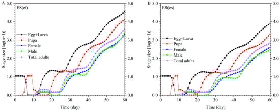 Using the survival, development, and fecundity data obtained from these experiments results, the population growth of both populations was predicted using TIMING-MSChart software (Figure 7). Starting with 10 E. sophia eggs for both populations, after 60 days of reproduction, the ES(ef) population consisted of 36,374.55 eggs + larvae, 12,927.13 pupae, 1988.79 female adults, and 2284.04 male adults. In contrast, the ES(es) population had 8096.90 eggs + larvae, 2152.13 pupae, 399.75 female adults, and 294.49 male adults. The growth rate of E. sophia in the ES(ef) population was significantly faster than that of the ES(es) population, with significantly higher numbers of individuals at all stages on day 60.
