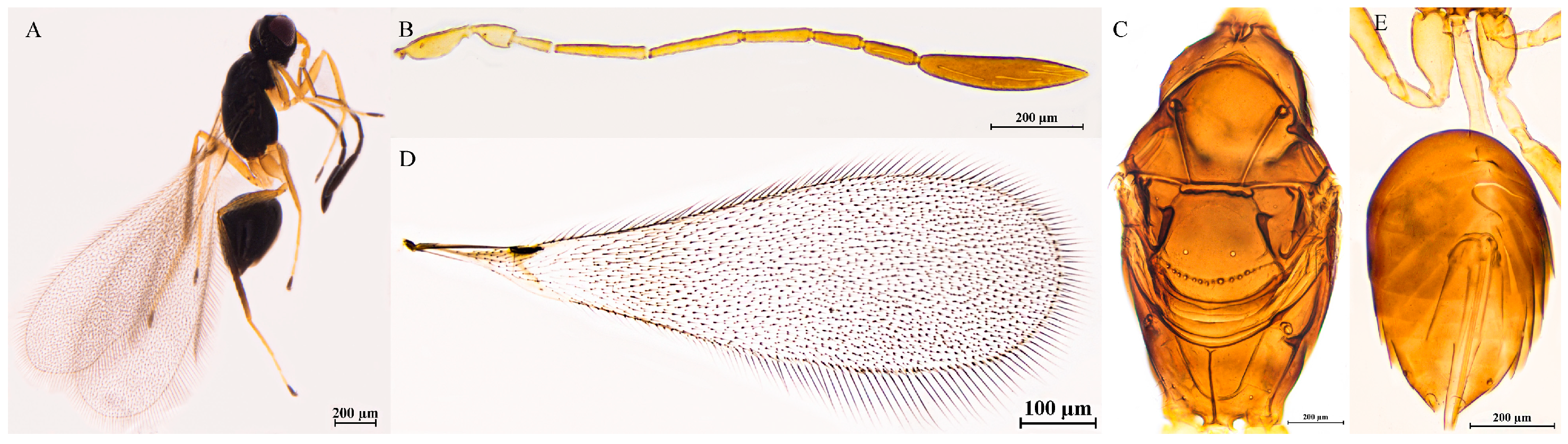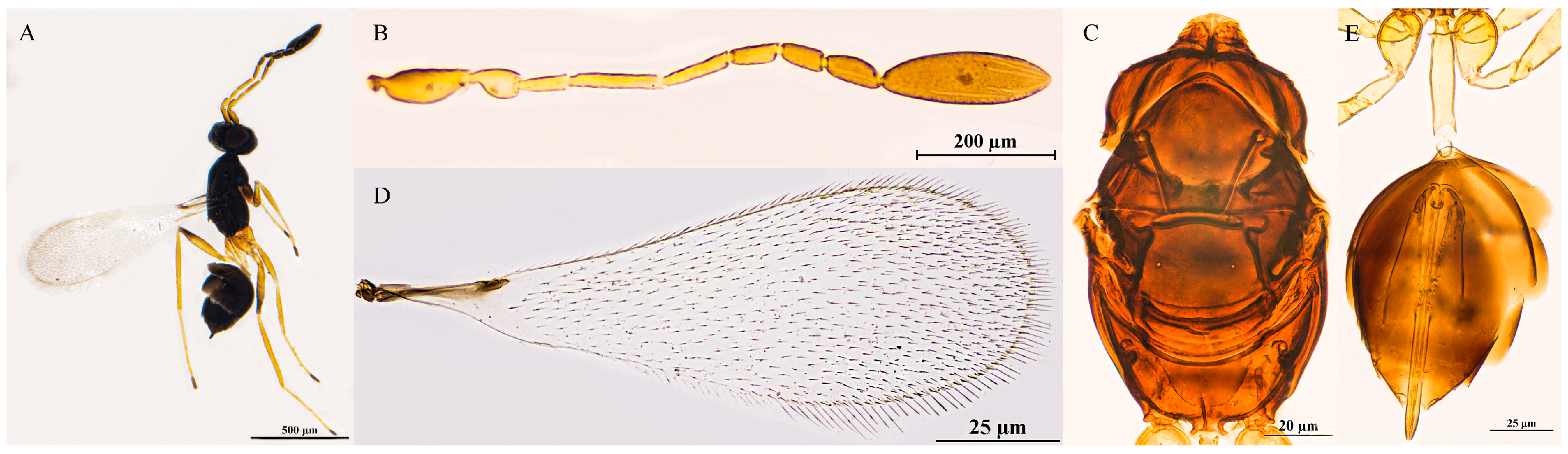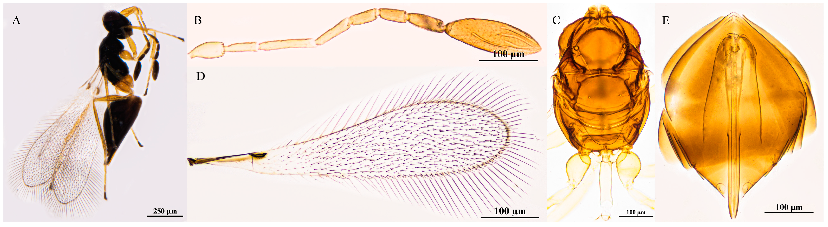 - Sharen, G.; Aishan, Z.; Wang, J.L. Description of Doriclytus Foerster as a subgenus of Polynema Haliday from Xinjiang (Hy-menoptera:Mymaridae). Acta Agric. Boreali-Occident. Sin. 2024, 33, 1567–1579. [Google Scholar] [CrossRef]