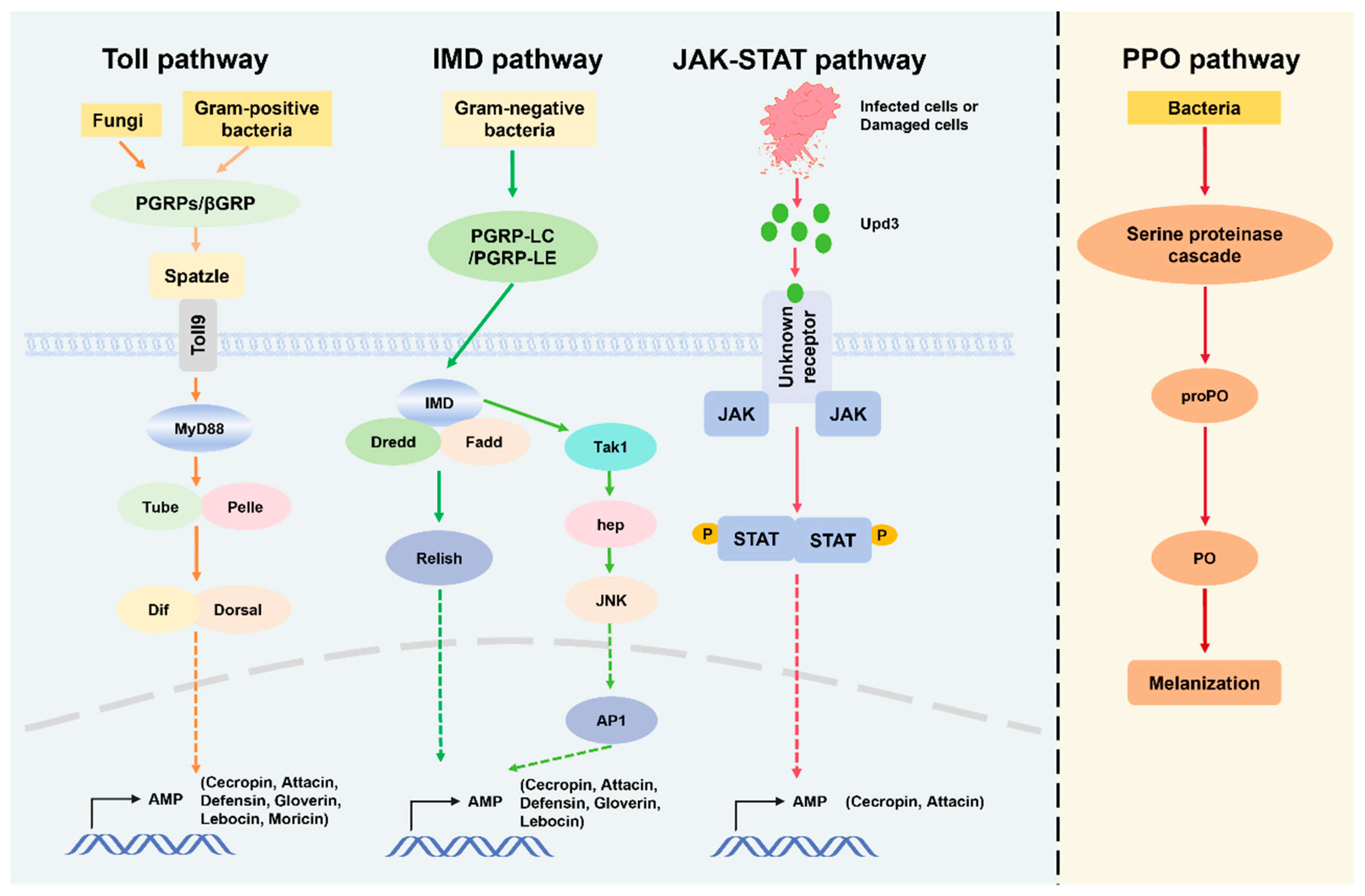 | Cecropin A, B, D, and E, Moricin, Defensin, Gloverin 1, 2, 3, and 4, Lebocin, Defensin A/B, and Attacin | Anti-Gram-negative bacteria; Anti-Gram-positive bacteria and antifungal | Toll and IMD pathways | [1,48,86,87,88,89,90] |