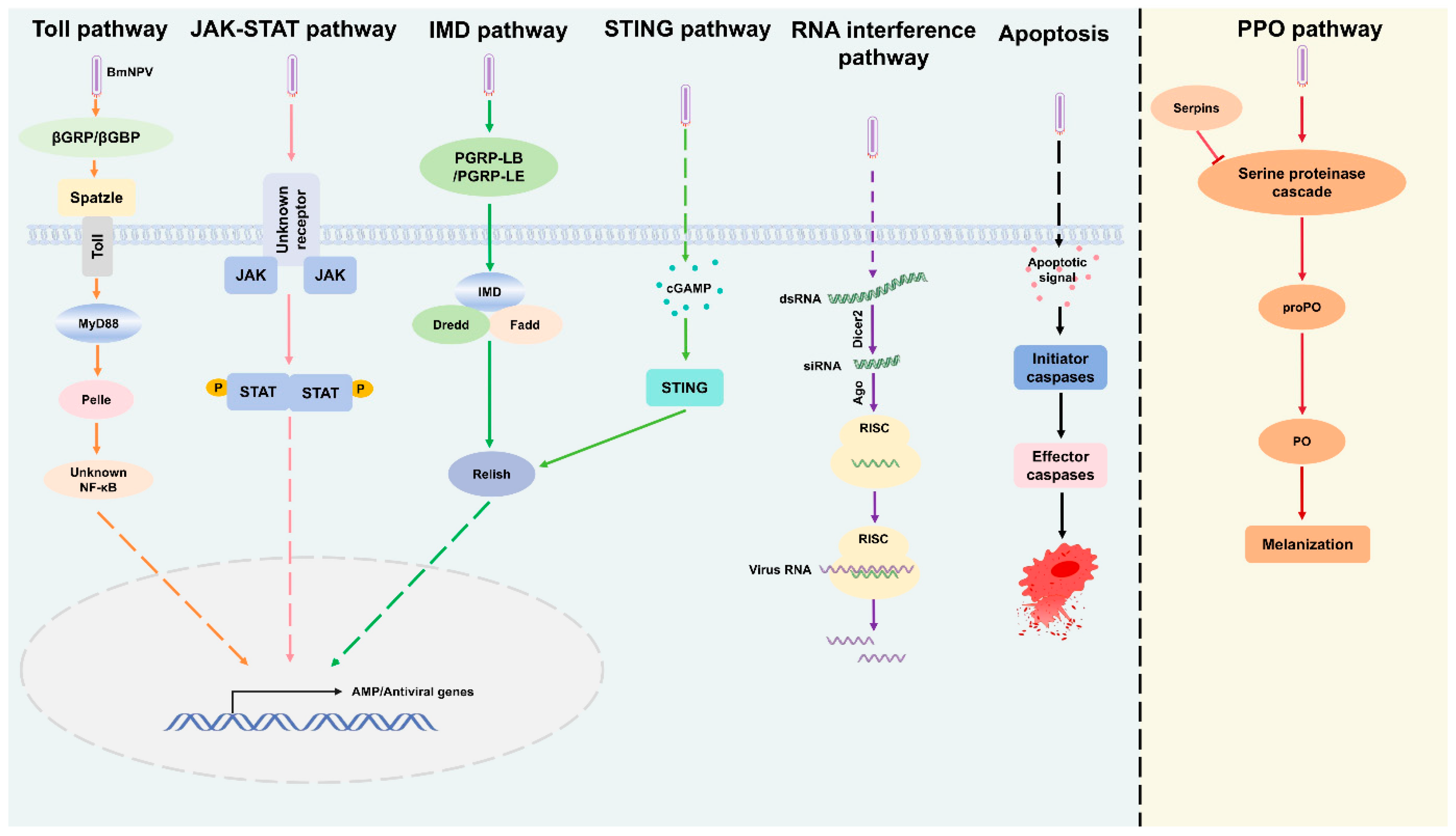 - Jiang, L. Insights into the antiviral pathways of the silkworm Bombyx mori. Front. Immunol. 2021, 12, 639092. [Google Scholar] [CrossRef]