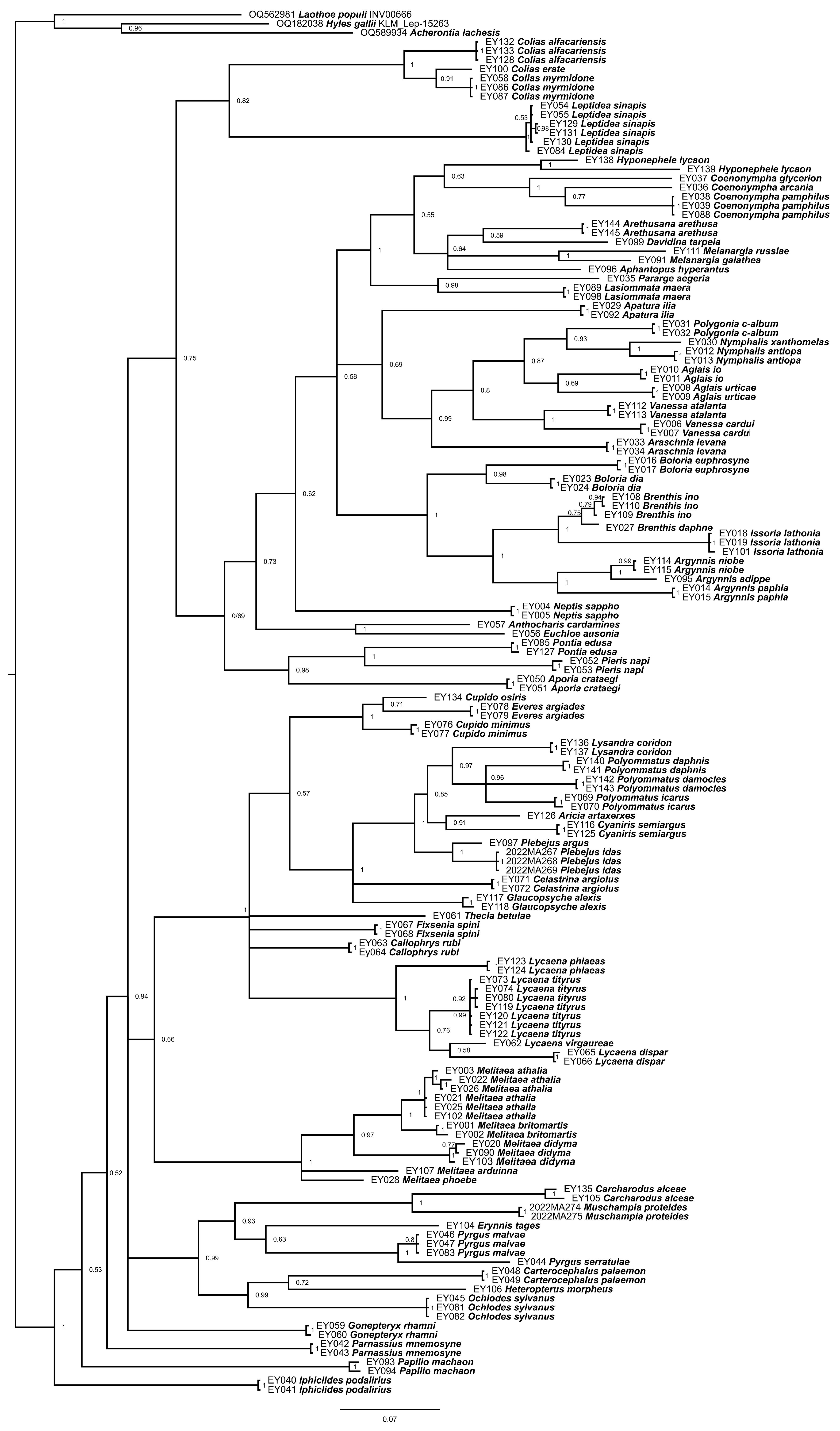 | Polyommatus icarus EY069 | Polyommatus icarus | P. juno (99.69) | Polyommatus icarus | 96 | existing taxonomy uncertainty | Yes |