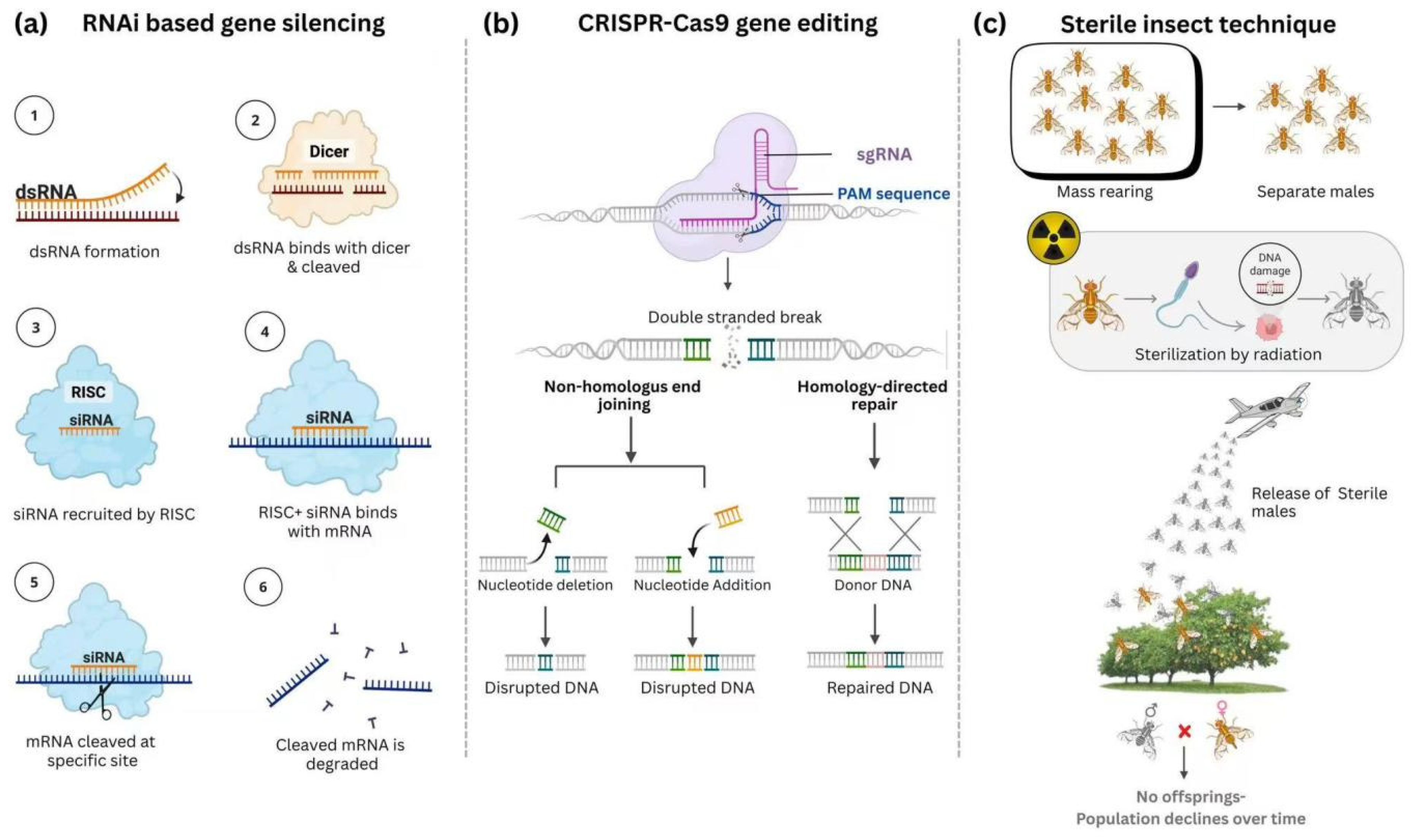 - Ying, Y.A.N.; Aumann, R.A.; Haecker, I.; Schetelig, M.F. CRISPR-Based Genetic Control Strategies for Insect Pests. J. Integr. Agric. 2023, 22, 651–668. [Google Scholar]