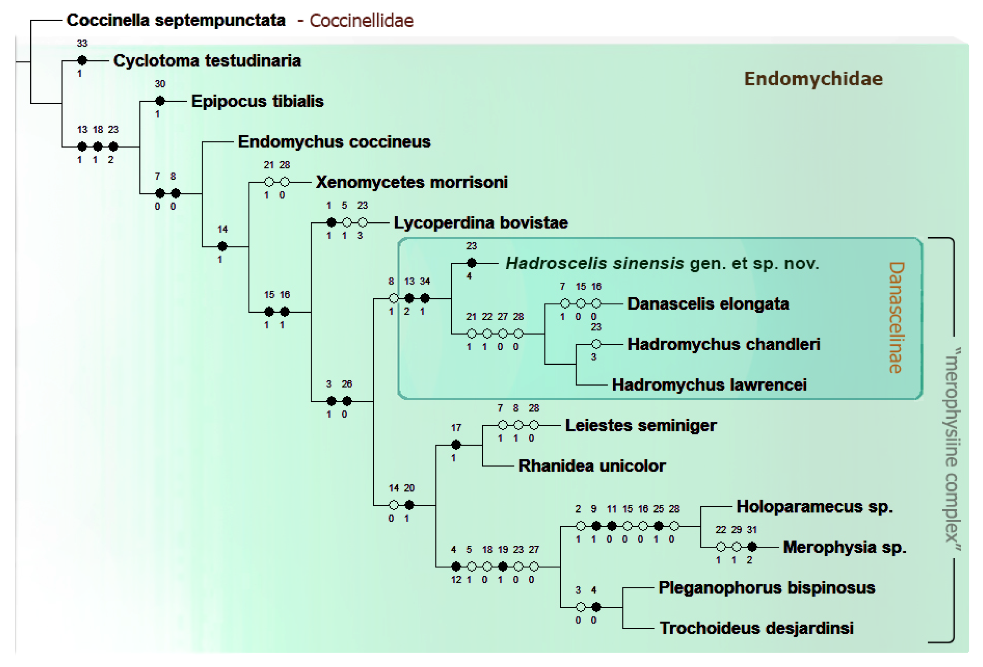 - Danascelinae is recovered as sister-group to the subfamilies of the ‘merophysiine complex’ of Endomychidae based on characters such as second tarsomere not enclosing the third one and antennal insertions mostly invisible from above.