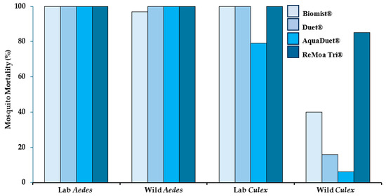Mosquito mortality 36 h post-exposure in the wind tunnel to insecticide formulated products Biomist®, AquaDuet®, and Duet® and 48 h post-exposure for ReMoa Tri®. Four different mosquito populations were exposed to each product in the wind tunnel for 10 s before being transferred to clean cages for mortality assessment.
