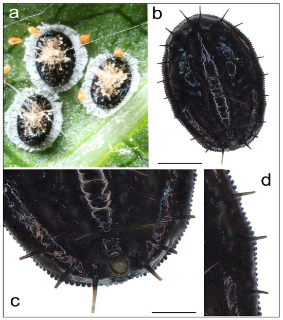 Puparia of Aleurocanthus spiniferus with the characteristic wax secretion (a), the characteristic of the dorsal spines (b), the posterior part of the abdomen (with the vasiform orifice) (c), and the marginal teeth (d). Scale bar: 200 µm.