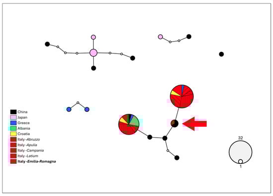 Haplotype network analysis computed on 657 bp of the COI gene of Aleurocanthus spiniferus. The circles denote the haplotypes, while the circle area represents the haplotype frequency. Small white circles indicate putative/missing haplotypes. Networks that fall below the value of the 95% connection limit are disconnected. The red arrow shows the new haplotype for Europe, found in Emilia-Romagna.