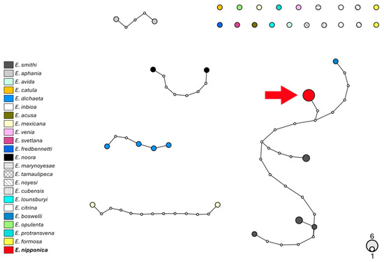 Haplotype network analysis on 672 bp of the COI gene of Encarsia. Circles denote haplotypes, while circle area represents haplotype frequency. Small white circles indicate putative/missing haplotypes. Networks that fall below the value of the 95% connection limit are disconnected. The red arrow shows the haplotype found in Emilia-Romagna specimens.
