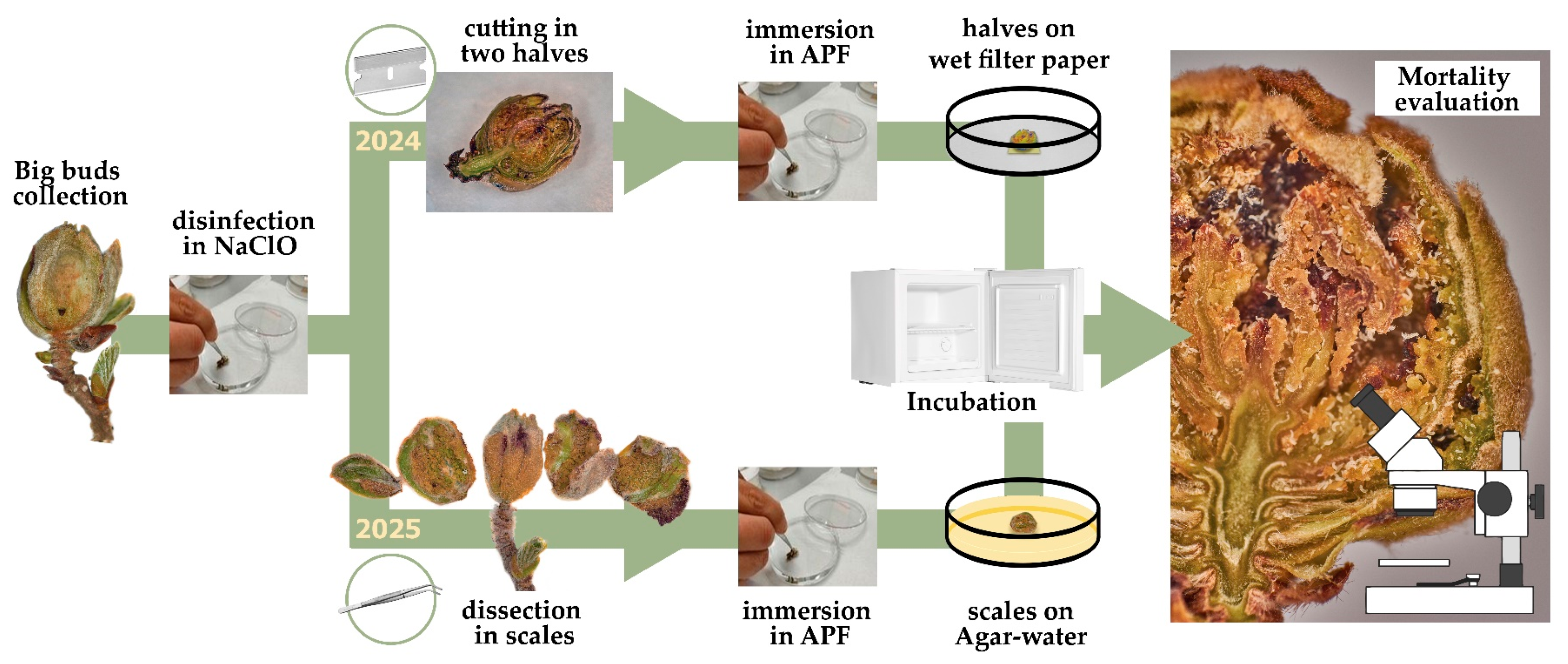 Twigs with big buds were collected from the field during the winter of 2023–2024, the winter of 2024–2025 and the early spring of 2025 to set up the protocol and to investigate the potential APF efficacy across seasons. The infested galls were collected from the same commercial hazelnut orchard (cv. Tonda Gentile Romana) and conducted integrated pest management in Vitorchiano, district of Viterbo (lat. 42°27′41″ N, long. 12°11′14″ E), during the plant dormancy. The collected twigs were stored in sealed plastic bags at about 4 °C. They were used for the assay within two weeks of their collection. Before the application, the twigs were brought to room temperature, the bud galls were selected, taking only the intact ones, and surface-sterilized through immersion in 0.5% sodium hypochlorite solution for 10 s, rinsed in sterile water for 10 s and then left to dry under a flume cap.