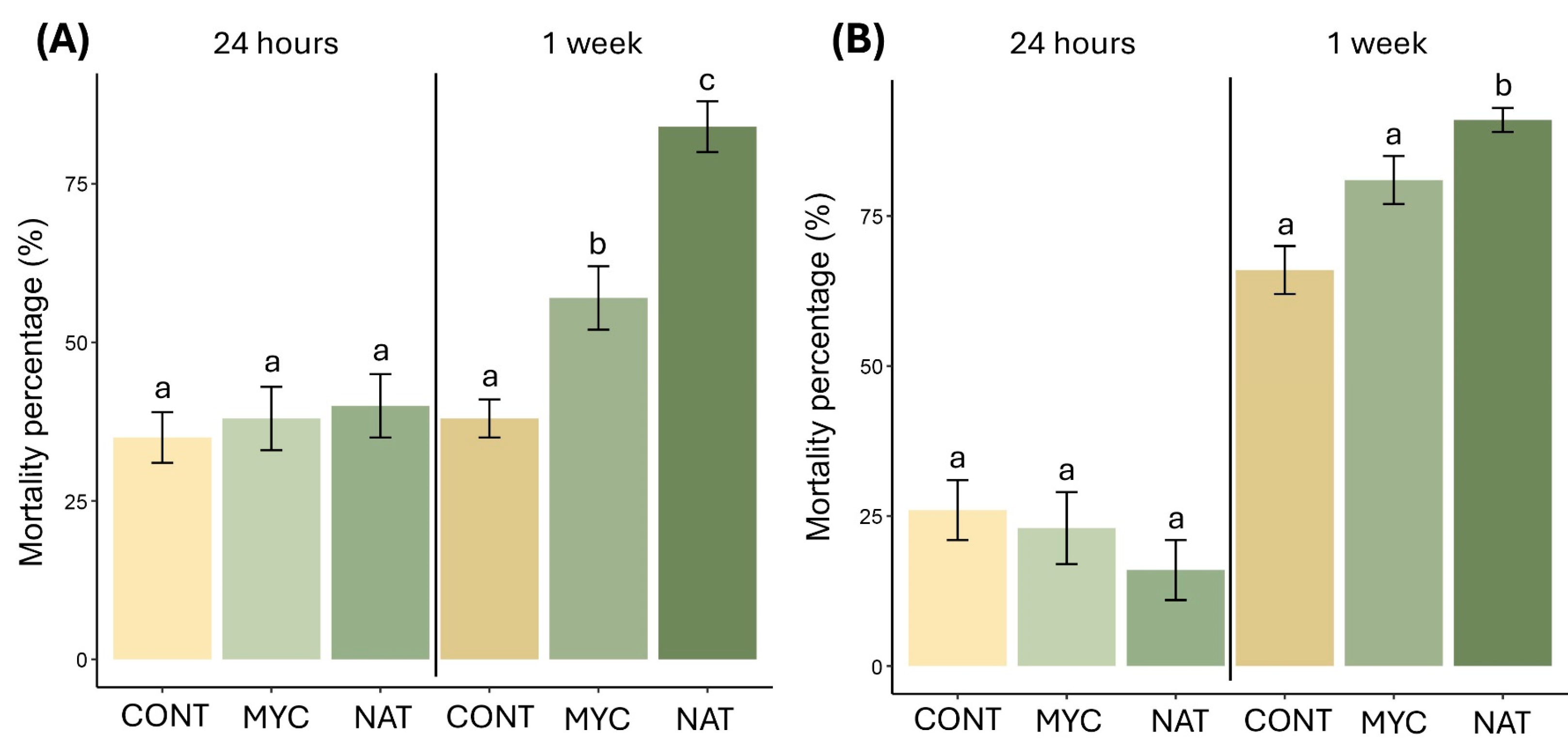 The laboratory assays carried out in winter 2024–2025 and early spring 2025 allowed us to correct the previously applied protocol and account for the mite biology. In fact, it was observed that galls collected in winter and in early spring had a different population structure, with more adults in winter, and more juveniles and eggs in the early spring, as expected. Consequently, the experiments conducted in the DISSPA and DAFNE laboratories could not be regarded as replicates, but rather as separated assays performed on different biological/physiological stages of the mite population within the galls. This approach aimed to address whether the population structure could influence the treatment efficacy, due to the presence of stages that were potentially more or less susceptible to APF infection.