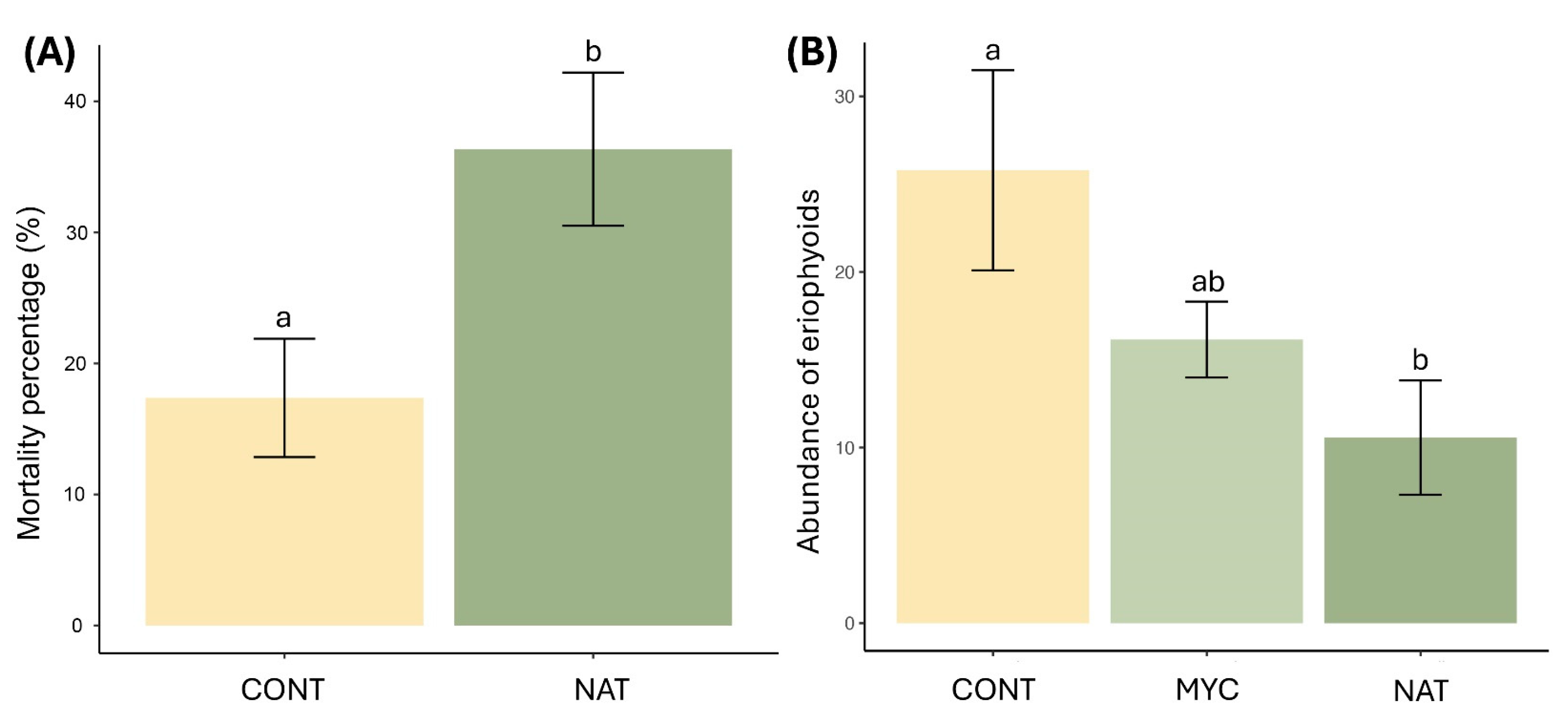 Statistical analyses revealed that both treatment and time significantly affected eriophyoid mortality in the laboratory assay that was carried out in winter 2024–2025. It is quite interesting to observe that the formulation based on B. bassiana exhibited almost the same higher efficacy (more than 85% of mean mortality) on both experimental conditions, whereas the formulation based on A. muscarius appears to be much more efficient when applied on galls collected in the early spring. However, the higher mite mortality on the galls treated just with water and Tween 20 for the galls collected in early spring should be considered, with respect to those collected in winter 2024–2025. These data can show a certain susceptibility of the mites to the environmental conditions, owing to the need to go out from the buds and look for a new bud.