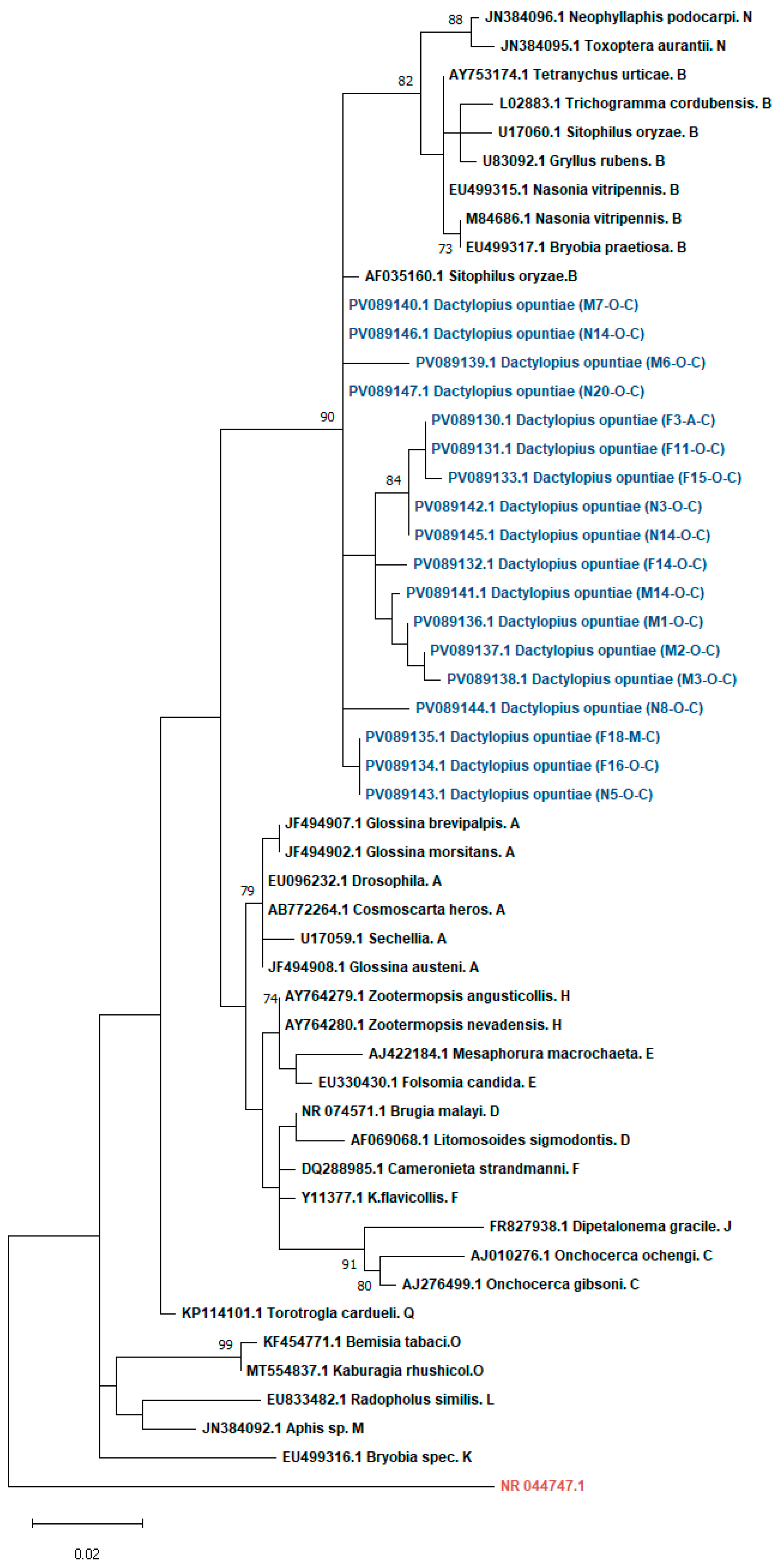 2.1. Dactylopius Opuntiae Collection and DNA Isolation