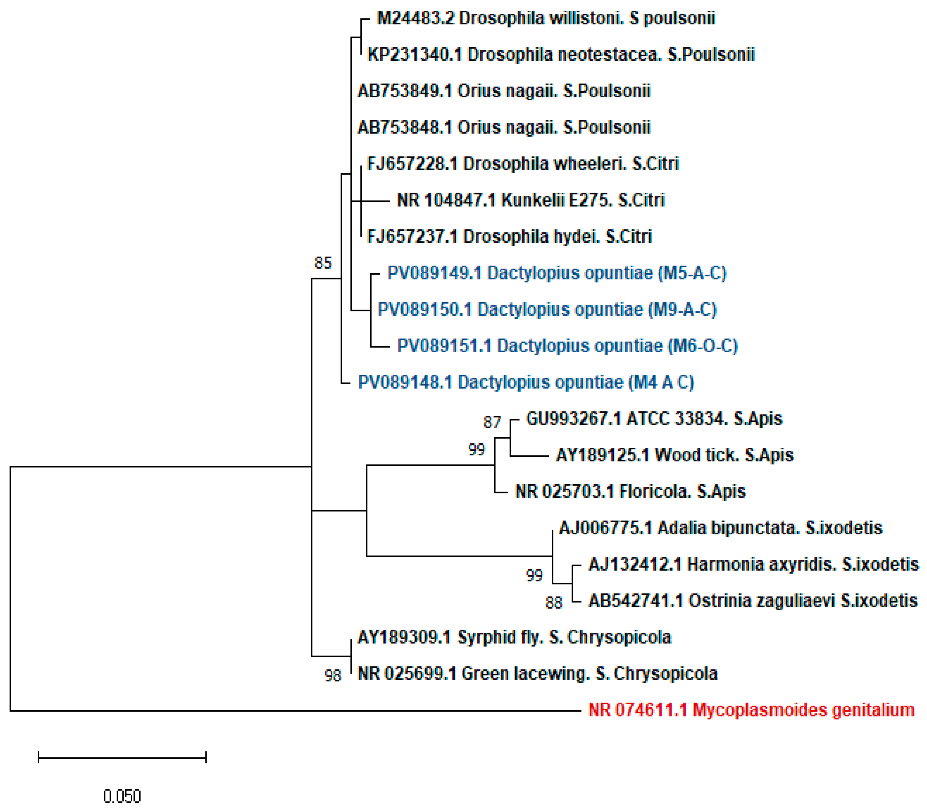 3.1.2. Phylogenetic Analysis of Wolbachia and Spiroplasma Sequences in D. opuntiae Populations