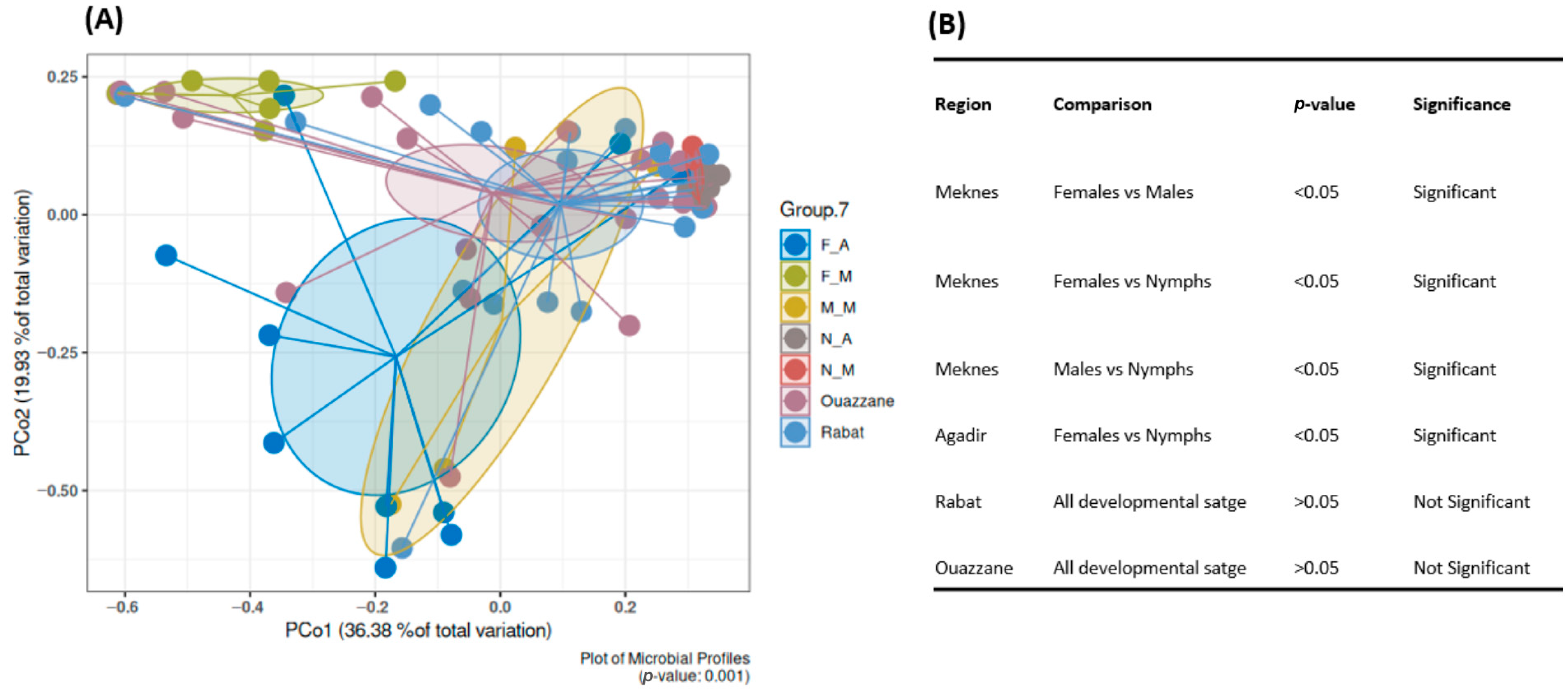 3.2.2. Bacterial Diversity and Composition Among D. opuntiae Gender and Developmental Stage, Excluding Candidatus Dactylopiibacterium