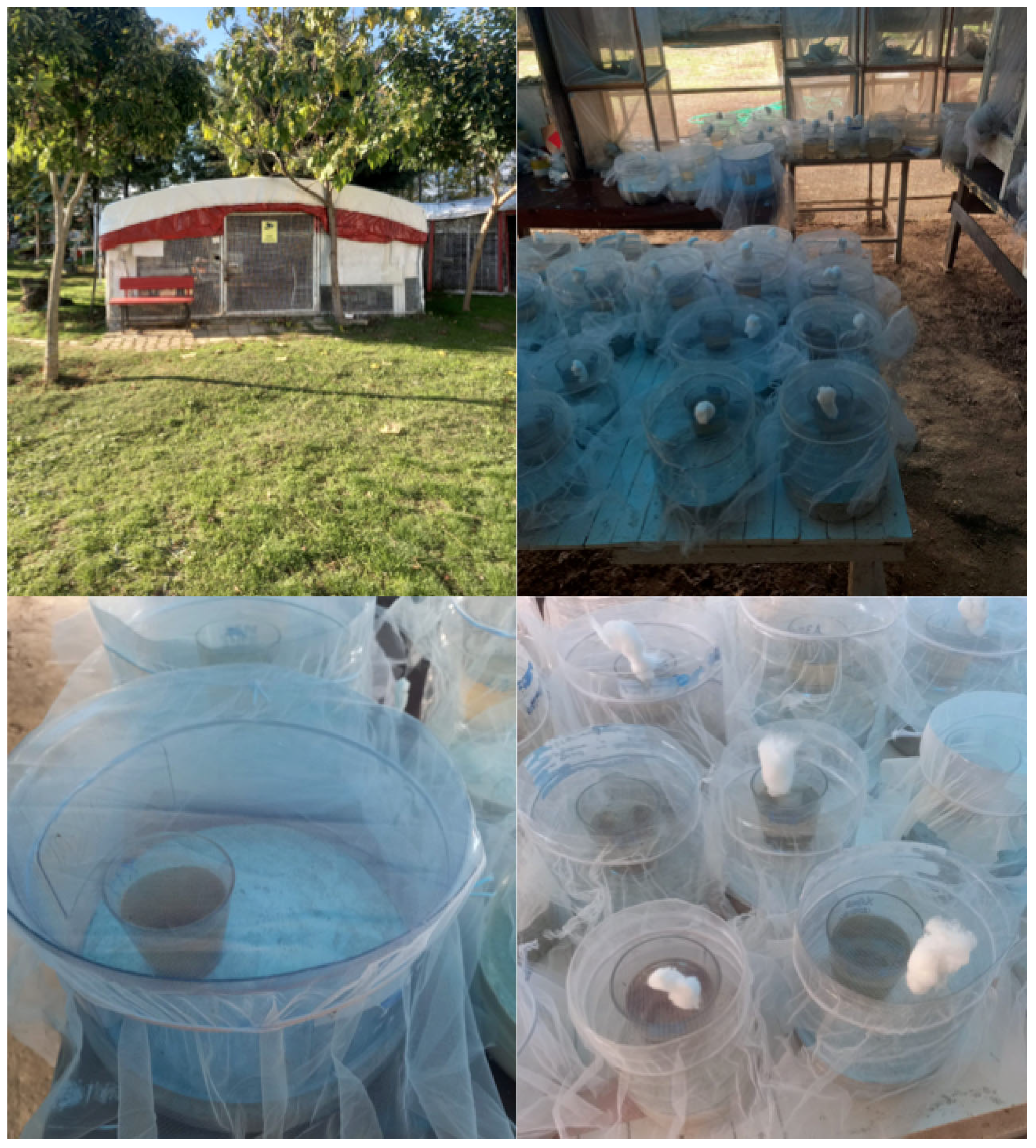 Figure 1. Images of the study area and experimental setup, showing the greenhouse in the field and the containers used to rear larvae.
