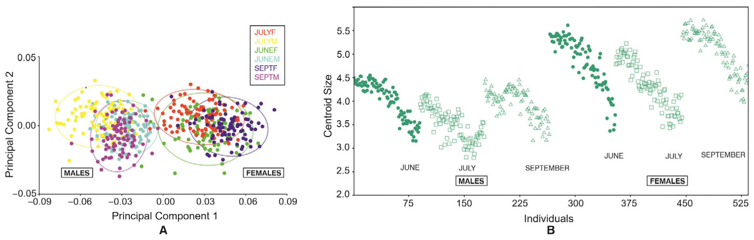 Figure 3. (A) Principal Component Analysis of Culex pipiens examined in the study explaining the sexual dimorphism in landmark data on the first two PCs. Colors indicate different seasonal periods. Each point represents one individual. (B) Distribution of the Centroid Sizes among the same periods.