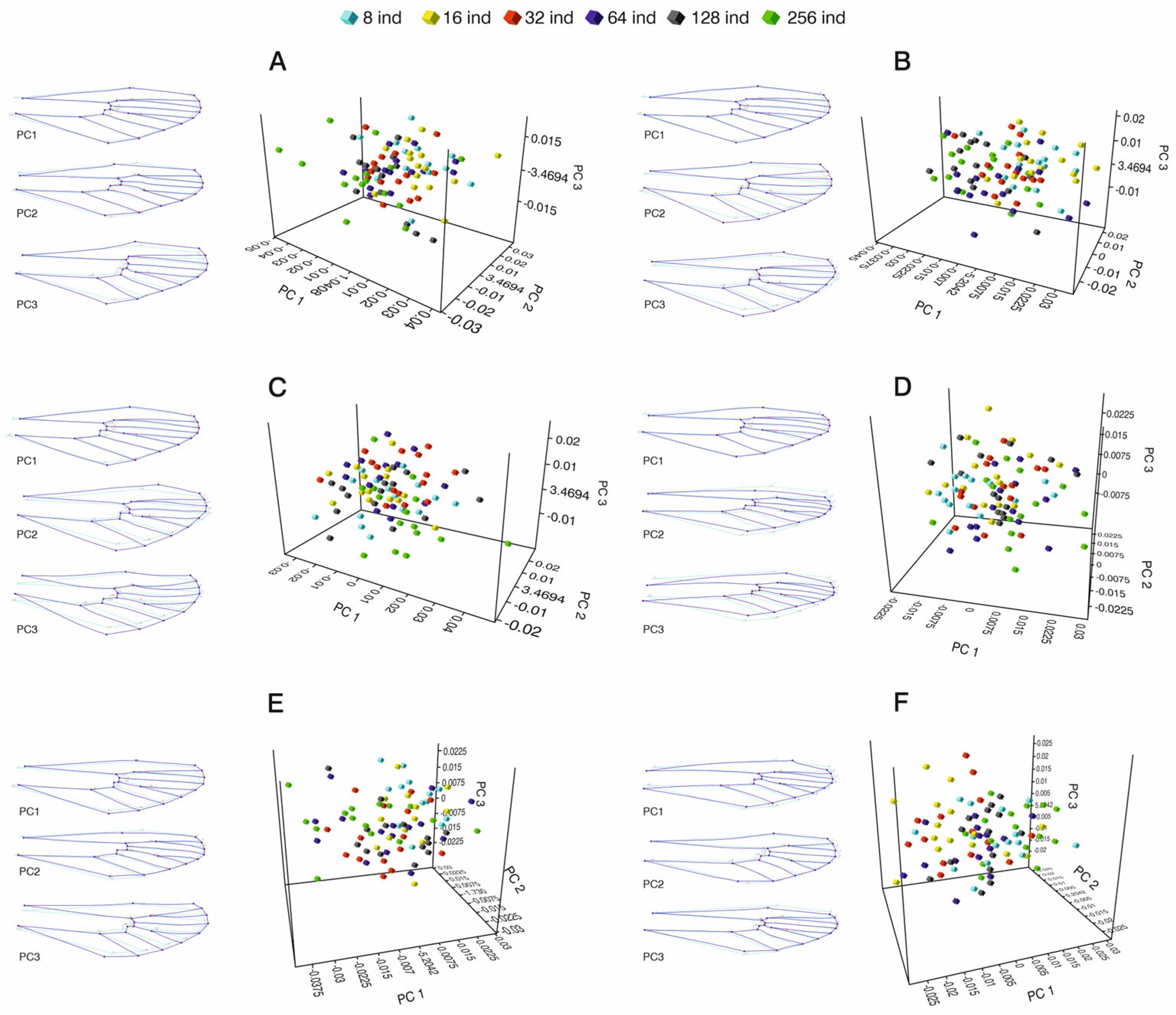 Figure 4. Distribution of wing shape across right wings from Culex pipiens, with comparison of mean shape configurations for each sex and seasonal period. Light color indicates mean shape, whereas dark color indicates the deformation for each PC (PC1, PC2, and PC3). In the 3D PCA graphs, each color represents different larval densities. Each 3D graph has been rotated to better visualize the groupings. (A) Females (June); (B) females (July); (C) females (September); (D) males (June); (E) males (July); and (F) males (September).