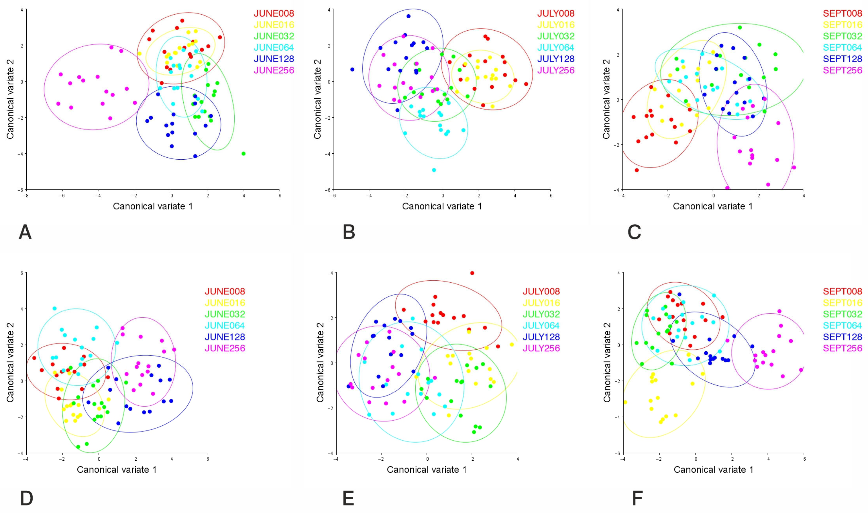 To better visualize the pattern of grouping among density groups Canonical Variate Analysis (CVA) was also performed, showing that the density groups comprising 128 and 256 individuals clearly segregated into different clusters compared to the rest in females in June (Figure 5A), with the variation among groups scaled by the inverse of the within-group variation of 76.34% (p < 0.005 MANOVA F = 318). The density groups segregated clearly into different clusters in July (Figure 5B), with variation among groups scaled by the inverse of the within-group variation of 70.87% (p < 0.005 MANOVA F = 318), showing a pattern similar to that of June and very similar to that of September (within-group variation of 65.60%) (p < 0.005 MANOVA F = 511) (Figure 5C). In males, the situations were very similar for all study periods. In June, all groups also separated clearly, as in females (Figure 5D), with a cumulative variation of 66.62% (p < 0.005 MANOVA F = 216). Similar results were observed in July and September, as the first two Canonical Variates explained 59.66% of the total variation (p < 0.005 MANOVA F = 216) (Figure 5E) in July and 74.44% of the total variation (p < 0.005 MANOVA F = 416) in September (Figure 5F).
