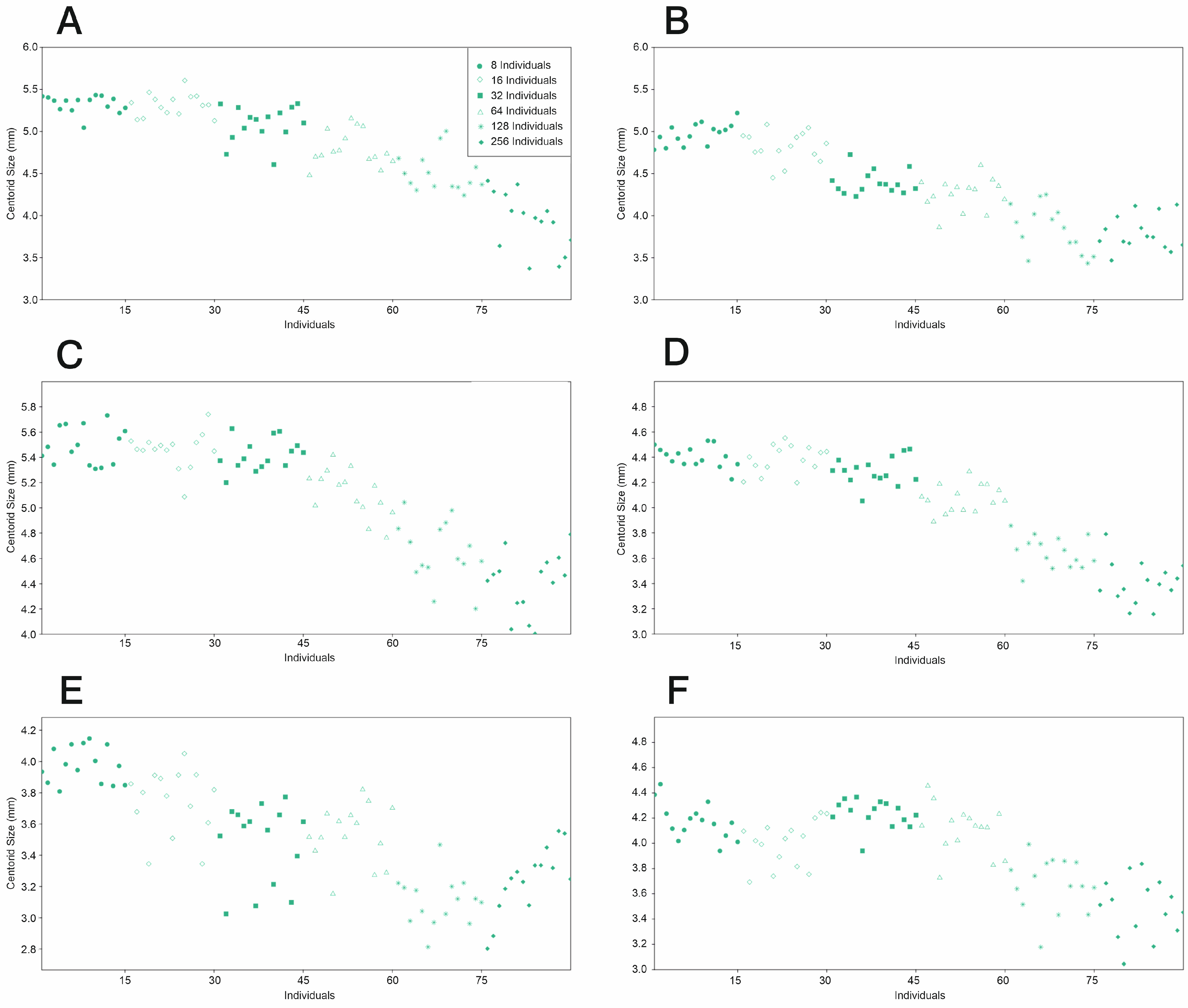 The differences in wing structure in all density effect groups in June had an effect on the variability of the landmarks, as shown by the Centroid Size values, a typical indicator of size. It can be observed that the wings become gradually smaller as the density increases in females (Figure 6A) (p < 0.005 ANOVA F = 93.81), and separation occurred in all but the 8-individual and 16-individual groups, which overlapped. Very similar results were obtained in July and September. It can be observed that the wings become gradually smaller as the density increases (Figure 6B) (p < 0.005 ANOVA F = 96.55), as in June, but in July, the female groups had pairings in terms of wing size, as the 8–16, 32–64, and 128–256 groups had similar Centroid Sizes. In September, it can be observed that the wings gradually became smaller as the density increased in females (Figure 6C) (p < 0.005 ANOVA F = 93.47), and the first three groups—containing 8, 16, and 32 individuals, respectively—had similar Centroid Sizes, whereas the others did not, like in June. A very similar pattern was observed in males, with some slightly different nuances, like in June (Figure 6D) (p < 0.005 ANOVA F = 40.33). In July, the wing size groupings were similar to those in females, as the 8–16, 32–64, and 128–256 groups had similar Centroid Size values. In July, the first three groups (containing 8, 16, and 32 individuals, respectively) had size similarities, whereas the other groups had clearly different values (Figure 6E) (p < 0.005 ANOVA F = 180.90), as in females. In September, the pattern was also similar to that of the females (p < 0.005 ANOVA F = 40.04), being very similar to the results obtained in June, in which the 8–16- and 32-individual were similar, and the 128–256 groups were not (Figure 6F).