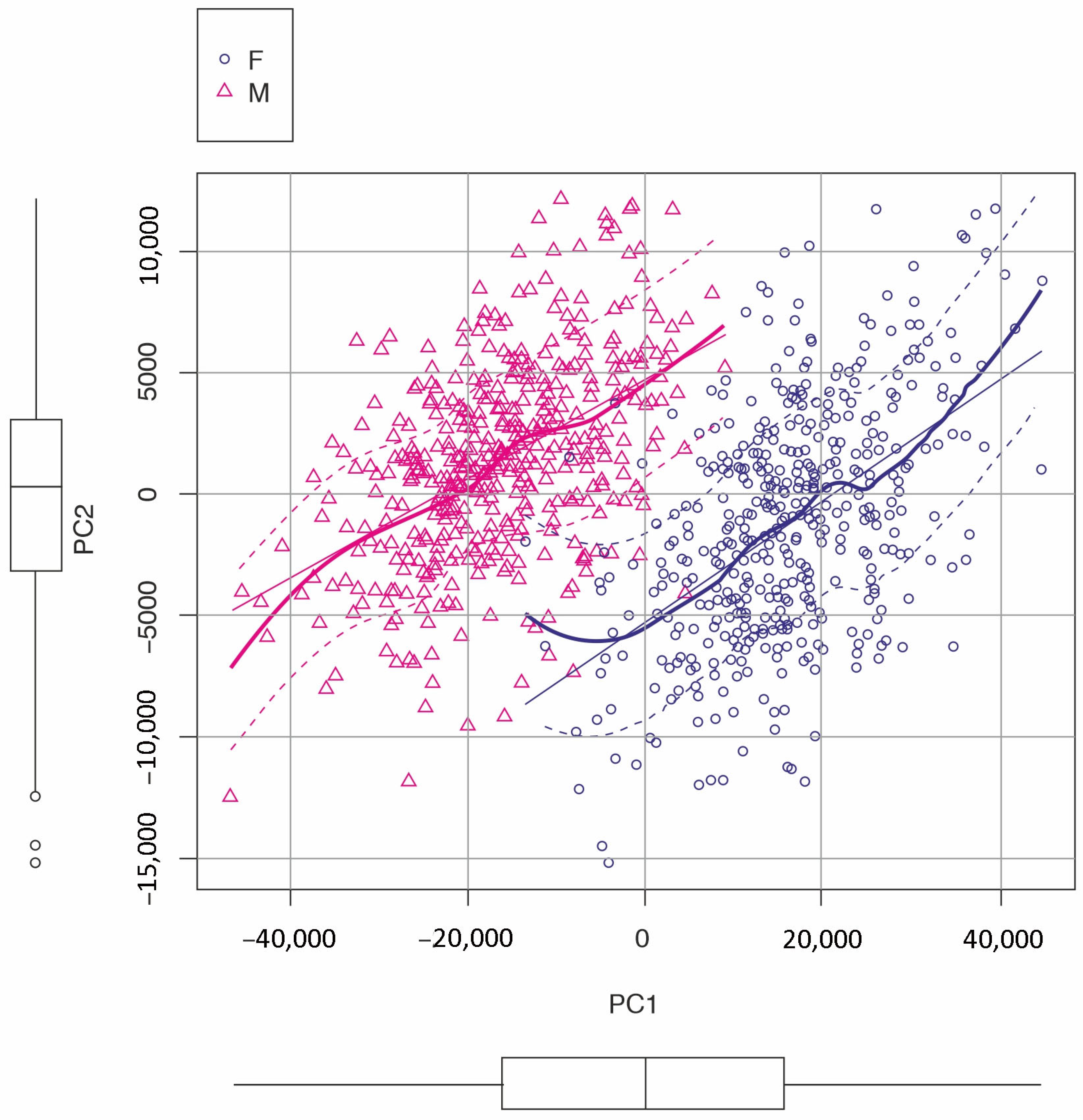 Figure 7. Elliptic Fourier Analysis of right wing contours in Culex pipiens reared in different seasons and at densities, with the first 2 PCs showing sexual dimorphism. Each figure represents one individual. Boxplots depict the variation in PCs. Each sex is represented by a different color and geometric shape.