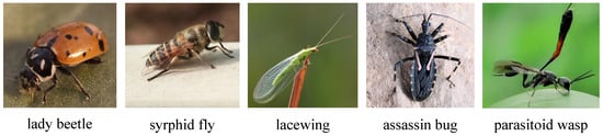 Data collection for this study was conducted from March 2023 to October 2024 across representative agricultural ecosystems located in Bayan Nur (Inner Mongolia), Tangshan (Hebei), Mengzi (Yunnan) and the Internet, encompassing farmland, forestland, and grassland habitats, as shown in Table 1. To comprehensively capture multimodal characteristics of natural enemies under natural conditions, synchronized acquisition systems were deployed at each site, consisting of a high-definition RGB camera (resolution 3840 × 2160, frame rate 30 fps) and a directional condenser microphone (frequency response 20 Hz–20 kHz, sampling rate 44.1 kHz). Both devices were calibrated through a unified time synchronization module to ensure temporal alignment between visual and acoustic streams. The acquisition setup was mounted on an adjustable tripod approximately 1.2 m above ground, with the camera angle dynamically adjusted according to vegetation height and lighting conditions. Each site was recorded for 3 h daily, divided into morning (6:00–9:00), midday (12:00–15:00), and evening (17:00–20:00) sessions, thereby encompassing the major activity periods of natural enemies. The visual data primarily documented the behavioral dynamics of individual predators on crop leaves, stems, and soil surfaces, covering a broad range of illumination intensities, background complexities, and occlusion levels to enhance environmental diversity. Approximately 32,000 images were collected, including around 8000 of lady beetles, 6500 of lacewings, and 5400 of parasitoid wasps, in addition to spiders, assassin bugs, and syrphid flies, as shown in Figure 1. Each image was manually annotated with species labels, bounding boxes, and pose information.