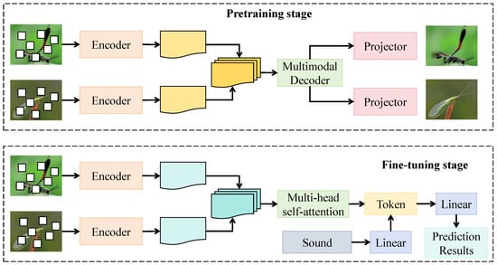 The cross-species contrastive learning module is designed to construct a multimodal joint representation space that enhances the discriminative ability of the model between morphologically similar species while maintaining semantic consistency across modalities. As shown in Figure 4, this module consists of dual encoders, a projection head, and a multimodal decoder, corresponding to the pretraining and fine-tuning stages. During pretraining, the visual and acoustic encoders operate in parallel, where the visual encoder receives () from the preceding module, and the acoustic encoder processes (). Both encoders undergo three residual attention layers before passing into a shared multimodal projection head, which maps the features into a unified embedding dimension . The projection head consists of two linear layers, with the first layer having a width of 512 and employing the GELU activation function, while the second layer outputs 256-dimensional vectors normalized by L2 regularization to constrain representation distributions. In the fine-tuning phase, a multi-head self-attention structure with eight heads and an embedding dimension of 256 is introduced, where each attention head learns semantic alignment relationships among different species. The fused features are subsequently decoded and fed into the classification layer to achieve cross-species feature alignment and category enhancement.