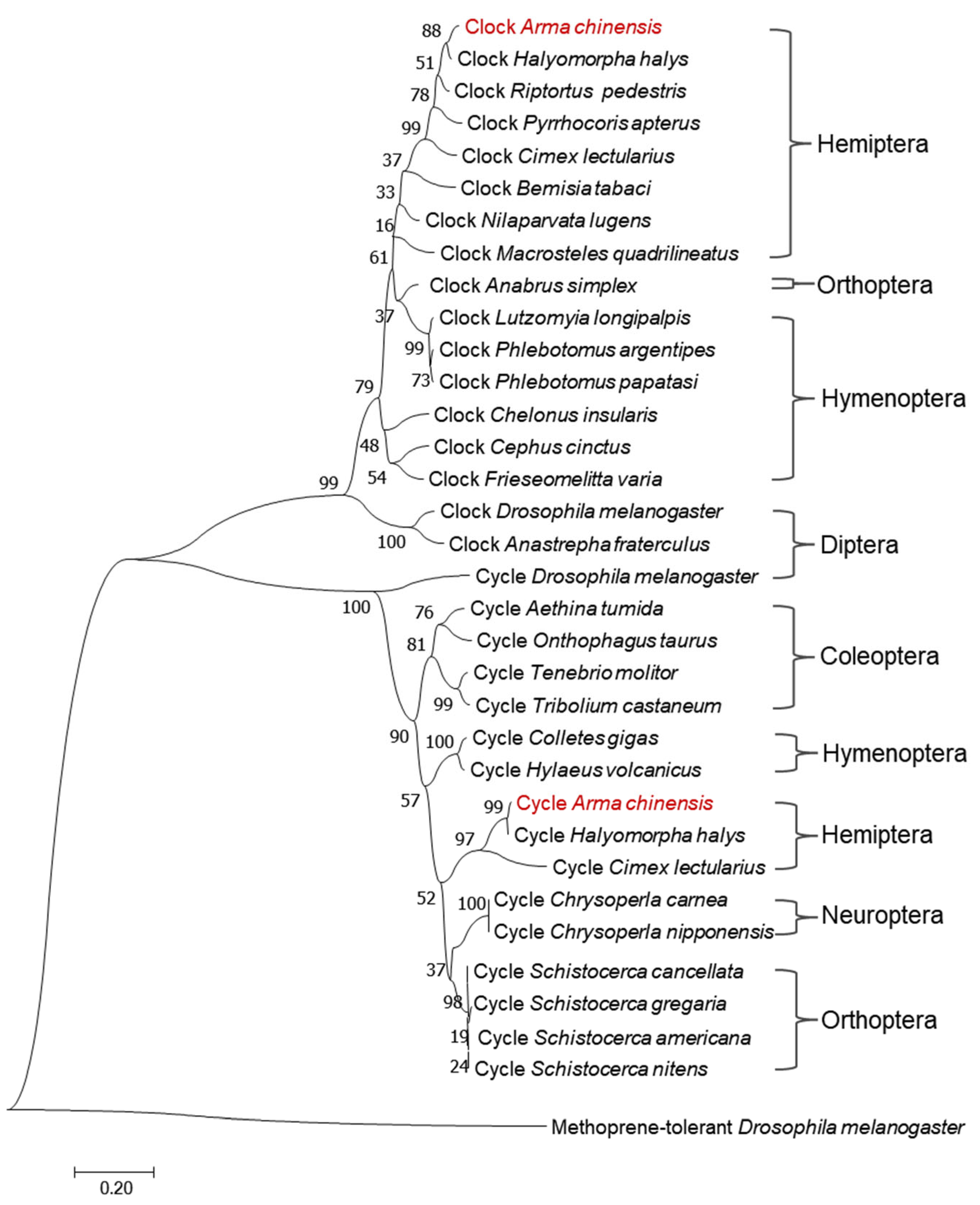 Figure 1. Evolutionary relationship of Cycle and Clock protein sequences. The phylogenetic trees were constructed based on amino acid sequences of Cycle and Clock using the Jones–Taylor–Thornton (JTT)-based neighbor-joining method with 1000 bootstraps.