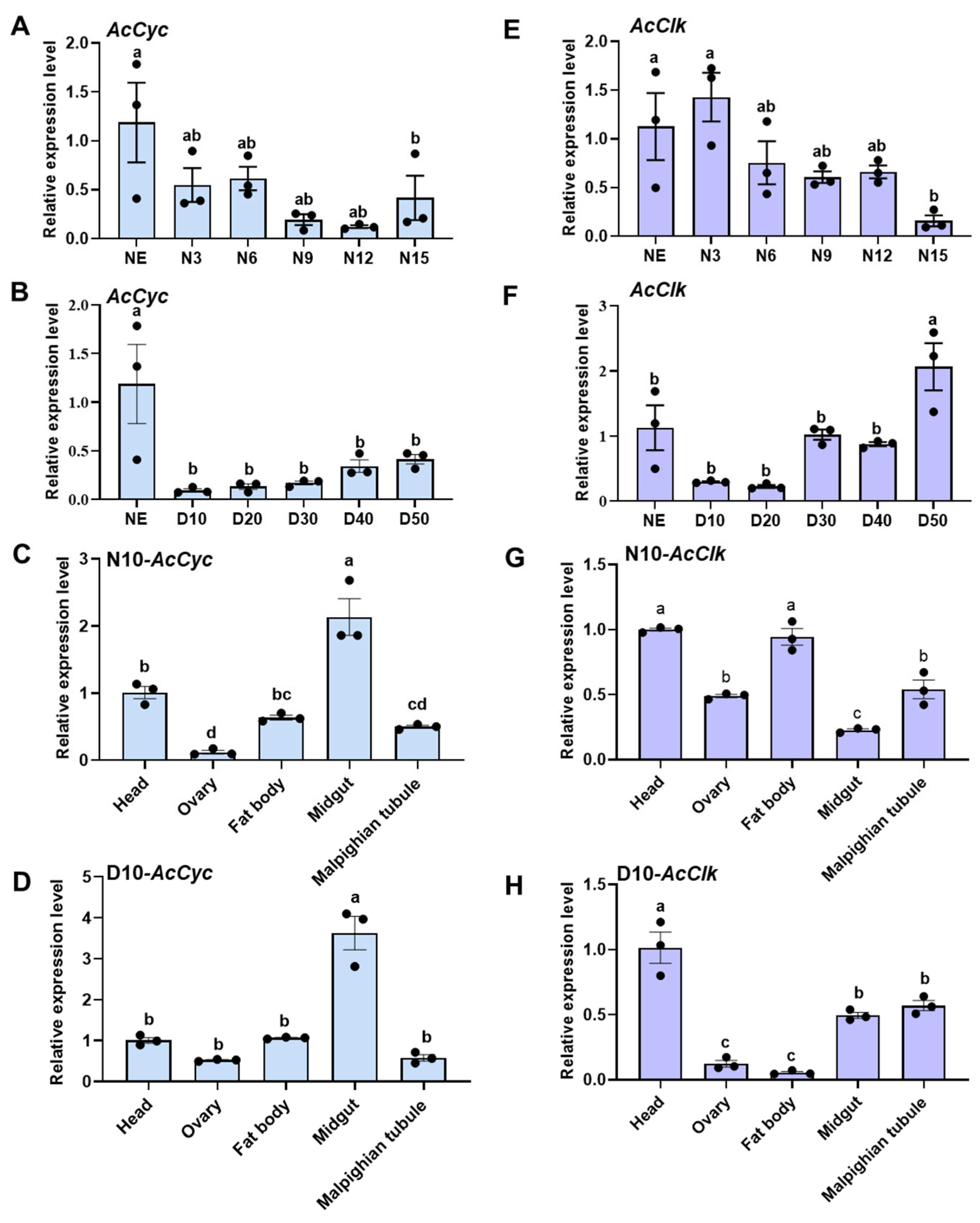 Figure 2. Expression profiles of AcCyc and AcClk at different developmental stages and in different tissues. Temporal expression patterns of AcCyc and AcClk under non-diapause (A,E) and diapause conditions (B,F). Spatial transcript expression analysis of AcCyc and AcClk under non-diapause (C,G) and diapause conditions (D,H). Data represent mean ± stand error of mean (SEM). Different letters indicated statistically significant differences between different samples using a one-way analysis of variance (ANOVA) with Tukey’s multiple comparisons test, p < 0.05. NE, N3, N6, N9, N12 and N15, respectively, represented the female adults at 0, 3, 6, 9, 12, and 15 days under non-diapause conditions. NE, D10, D20, D30, D40 and D50, respectively, represented the female adults at 0, 10, 20, 30, 40, and 50 days under diapause conditions.