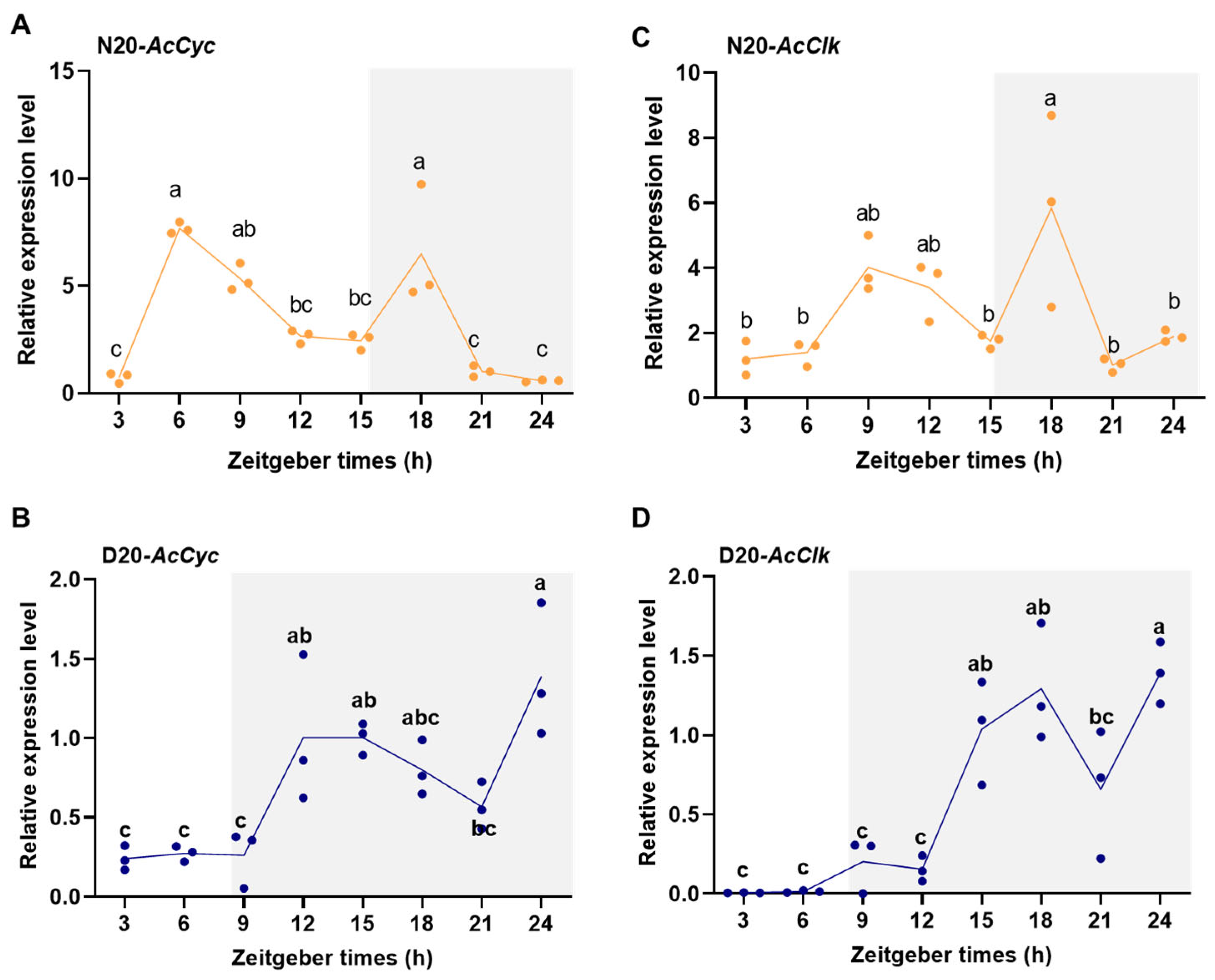 Figure 3. Diel expression of AcCyc and AcClk under non-diapause and diapause conditions. (A,C) Circadian rhythm expression pattern of AcCyc and AcClk under non-diapause condition. (B,D) Circadian rhythm expression pattern of AcCyc and AcClk under diapause condition. The gray shadow represented dark period. Data represent mean ± stand error of mean (SEM). Different letters indicated statistically significant differences using a one-way analysis of variance (ANOVA) with Tukey’s multiple comparisons test, p < 0.05.