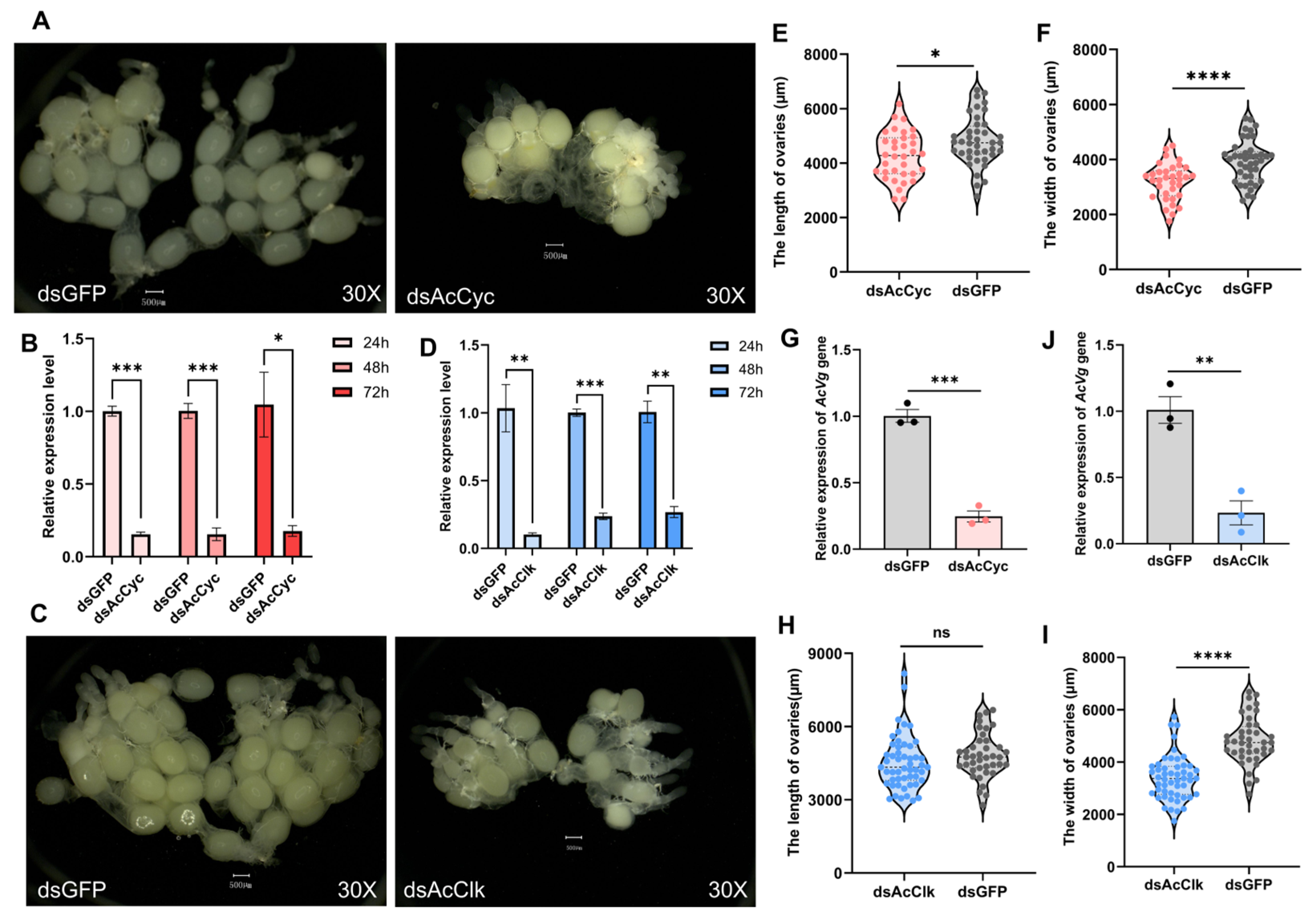 Figure 4. Effect of AcCyc or AcClk knockdown on ovarian development in A. chinensis female under non-diapause conditions. (A,C) Representative ovarian samples after dsRNA treatments. (B,D) Knockdown efficiency of AcCyc or AcClk at 24, 48 and 72 h after dsRNA treatment. (E,F,H,I) Ovary sizes (length and width) following AcCyc or AcClk silencing. (G,J) Expression of vitellogenin (Vg) after AcCyc or AcClk knockdown. Data represent mean ± stand error of mean (SEM). Asterisks indicate significant differences between dsGFP and dsRNA using Student’s t-test (* p < 0.05; ** p < 0.01; *** p < 0.001; **** p < 0.0001; “ns” indicate no signiffcant differences). The scale bar size was 500 μm.