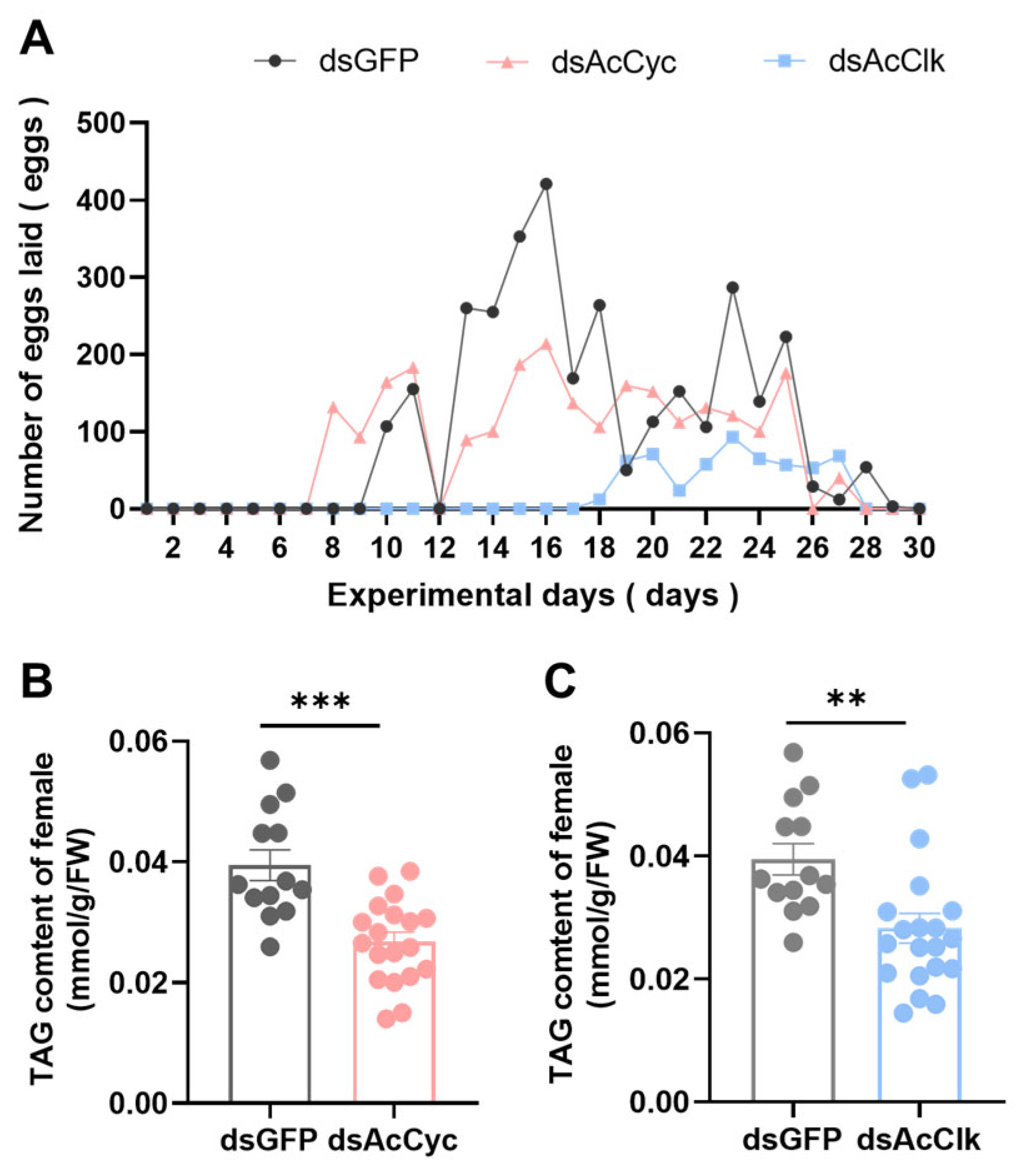 Figure 5. Effect of AcCyc or AcClk knockdown on reproductive capacity and energy metabolism in A. chinensis under non-diapause conditions. (A) Number of eggs laid by A. chinensis with AcCyc or AcClk knockdown under non-diapause conditions. (B,C) Effect of AcCyc or AcClk knockdown on TAG content in A. chinensis under diapause conditions. Data represent mean ± stand error of mean (SEM). Asterisks indicate significant differences between dsGFP and dsRNA using Student’s t-test (** p < 0.01; *** p < 0.001).