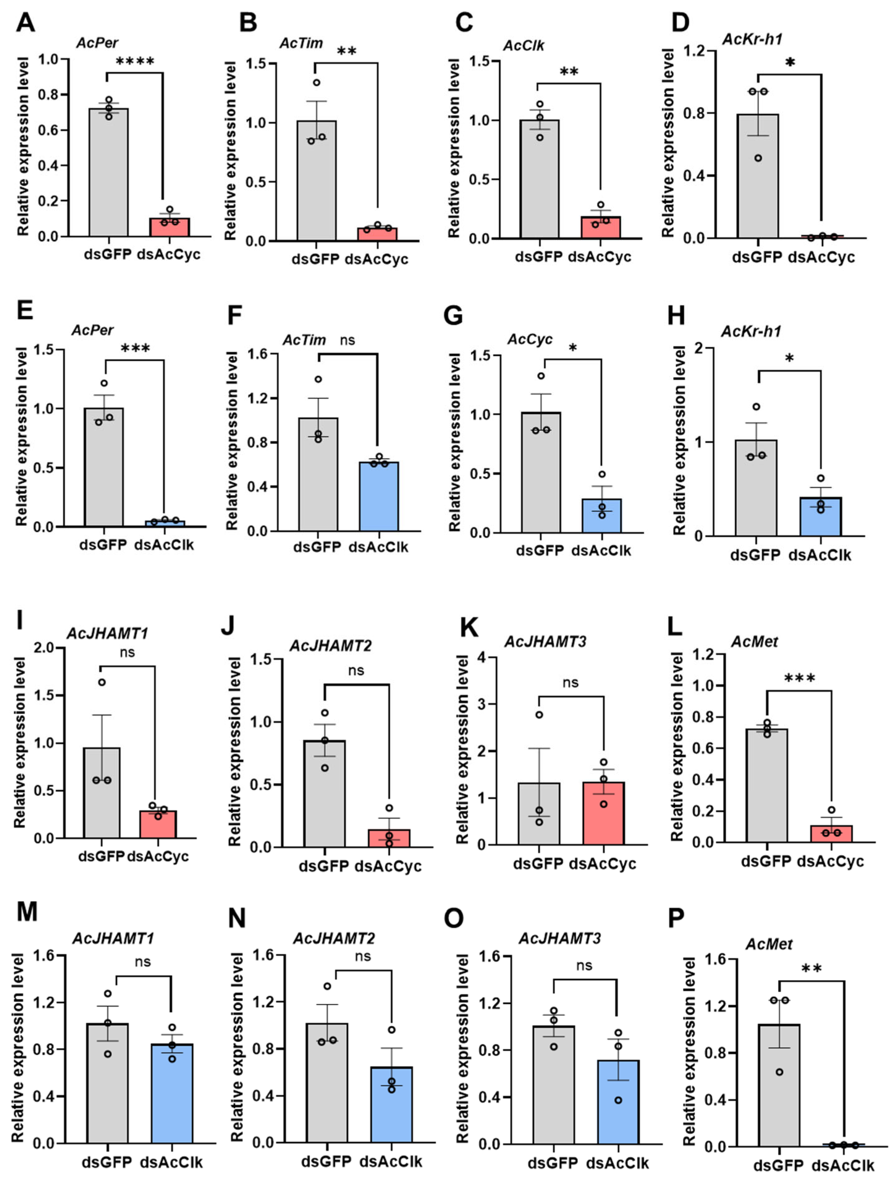 Figure 6. Effect of AcCyc or AcClk knockdown on juvenile hormone pathway genes and other circadian clock genes under non-diapause conditions. The expression levels of AcPer (A), AcTim (B), AcClk (C), AcKr-h1 (D), AcJHAMT1 (I), AcJHAMT2 (J), Ac JHAMT3 (K), and AcMet (L) genes after RNAi-AcCyc. The expression levels of AcPer (E), AcTim (F), AcClk (G), AcKr-h1 (H), AcJHAMT1 (M), AcJHAMT2 (N), Ac JHAMT3 (O), and AcMet (P) genes after RNAi-AcClk. Data represent mean ± stand error of mean (SEM). Asterisks indicate significant differences between dsGFP and dsRNA using Student’s t-test (* p < 0.05; ** p < 0.01; *** p < 0.001; **** p < 0.0001; “ns” indicate no signiffcant differences).