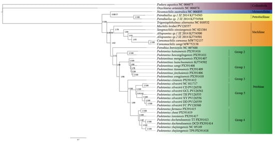 In recent years, research on phylogenetic relationships has expanded in both scope and analytical rigor. The majority of phylogenetic studies have consistently supported the monophyly of Hexapoda and Archaeognatha [,,,,,]. However, the internal classification system of Archaeognatha remains complex and continues to be a subject of active scientific debate. Ma et al. demonstrated that both Machilidae and its subfamily Machilinae are paraphyletic, whereas Petrobiellinae forms a monophyletic clade together with Meinertellidae. This finding challenges the previous morphological hypothesis of monophyly and provides critical molecular evidence for revising the phylogenetic framework of Archaeognatha []. Zhang et al. confirmed the monophyly of Meinertellidae through an integrative analysis of morphological and DNA data from 15 Burmese amber specimens []. Montagna subsequently expanded the analysis by incorporating two Triassic fossils and species from Zygentoma, further supporting for the monophyly of Meinertellidae and the paraphyly of the broadly defined Machilidae []. Cen et al. built upon previous work by including sequence data from six Pedetontus species, yielding preliminary support for the monophyly of this genus and revealing its sister-group relationship with Pedetontinus []. Palacios-Martinez et al. conducted a Bayesian phylogenetic analysis integrating COI, 18S rDNA, and ITS2 sequence data across multiple loci, demonstrating that Machilidae and its two subfamilies—Machilinae and Petrobiinae—are non-monophyletic []. Collectively, these findings underscore the need for an integrative taxonomic revision that incorporates multi-locus and multidisciplinary evidence to resolve systematic inconsistencies and clarify cladogenetic patterns within this lineage.