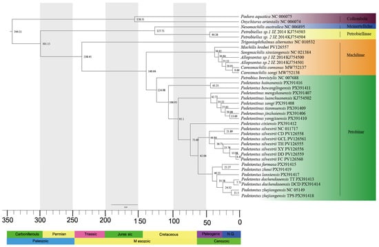 The chronogram, inferred from the BI phylogenetic tree, is presented in Figure 2. Phylogenetic analysis of Archaeognatha based on 13 mitochondrial PCGs reveals that the order originated during the Late Carboniferous period (301.15 Mya, 95% HPD: 298.88–303.67 Mya). Trigoniophthalmus alternatus, a member of the subfamily Machilinae, represents the earliest divergence from the main lineage, occurring in the Middle Triassic period (238.45 Mya, 95% HPD: 235–241.99 Mya). The split between the subfamilies Machilinae and Petrobiinae took place during the Jurassic period (140.64 Mya, 95% HPD: 94.65–222.39 Mya). Pedetontus hainanensis and Pd. bawanglingensis diverged from the main clade comprising the genera Pedetontus and Pedetontinus during the Early Cretaceous (106.93 Mya, 95% HPD: 70.46–170.92 Mya). The divergence between the genera Pedetontus and Pedetontinus occurred in the same geological period (92.1 Mya, 95% HPD: 60.61–145.97 Mya). Pedetontus cixiensis separated from the remaining members of the genus Pedetontus during the Late Cretaceous (73.69 Mya, 95% HPD: 46.24–114.85 Mya), followed by the divergence of Pd. silvestrii and Pedetontus populations from Zhejiang, Fujian, and Taiwan within the same epoch (62.06 Mya, 95% HPD: 38.68–98.34 Mya).