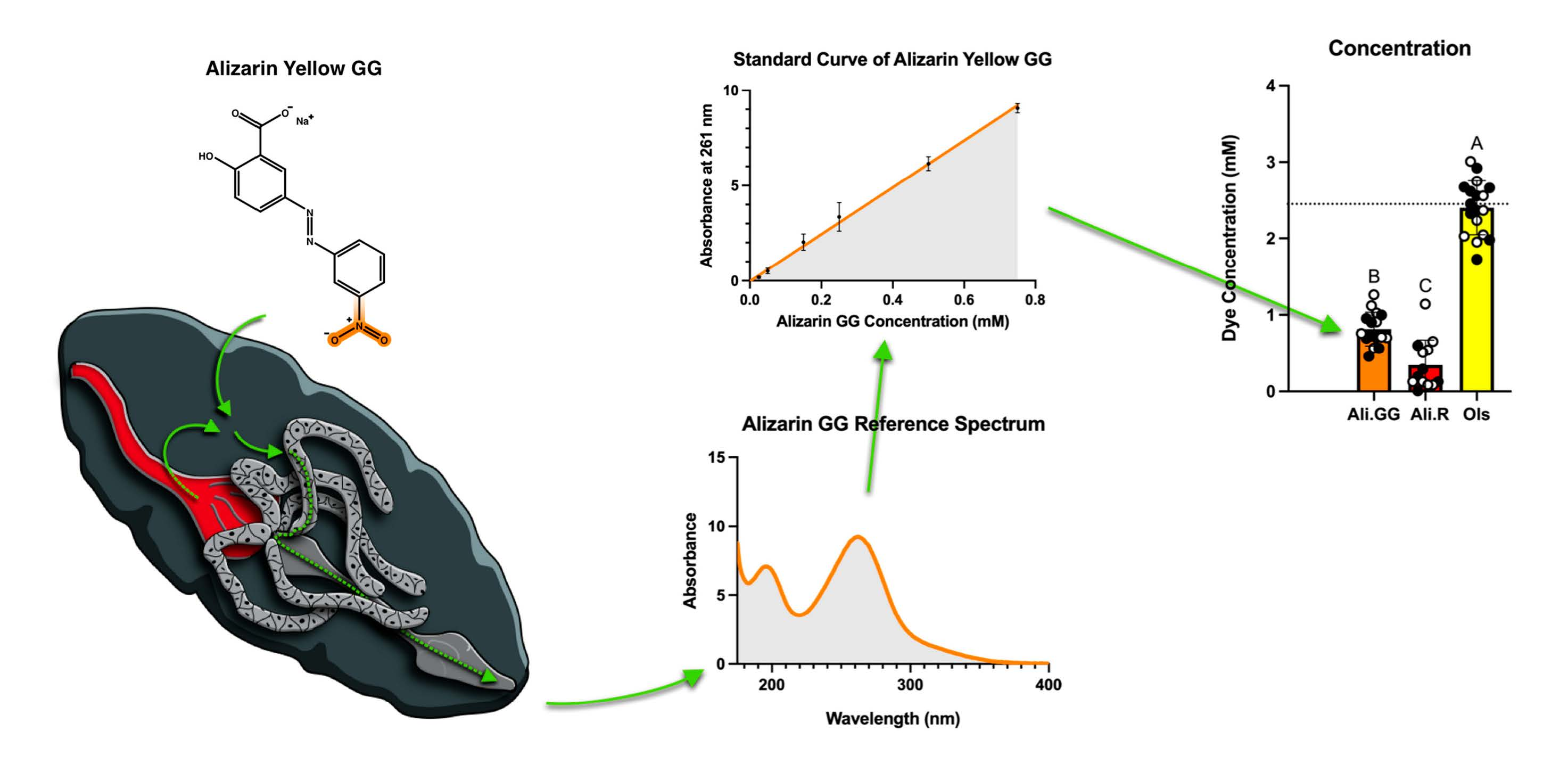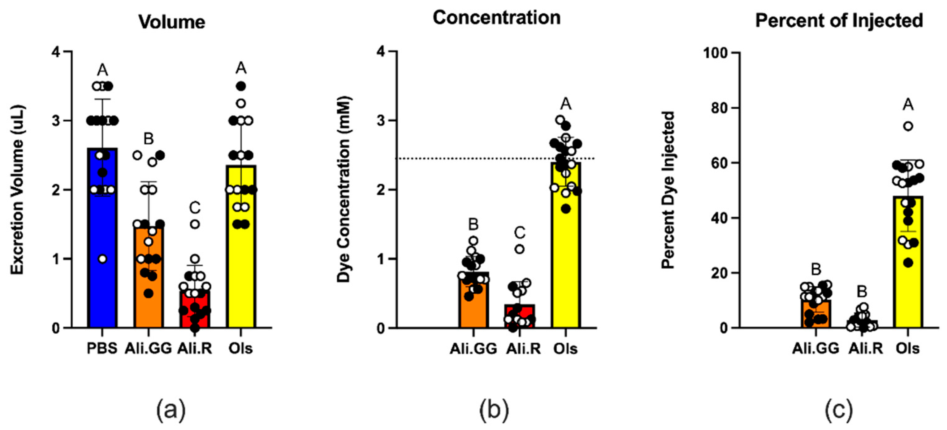 The concentration of dye excreted was greatest for Olsalazine, which is roughly three times more concentrated than Alizarin GG and six and a half times more concentrated than Alizarin R (Figure 4b). This aligns with the trends we see for voided volume. While the average excretion concentration for Olsalazine is 2.4 mM, some experimental groups had excretion concentrations as high as 3 mM which is higher than the injected concentration (2.5 mM), suggesting concentration of the solutes during excretion. Olsalazine was the only dye in which the excretion concentrations surpassed the injection concentration (Figure 4b).
