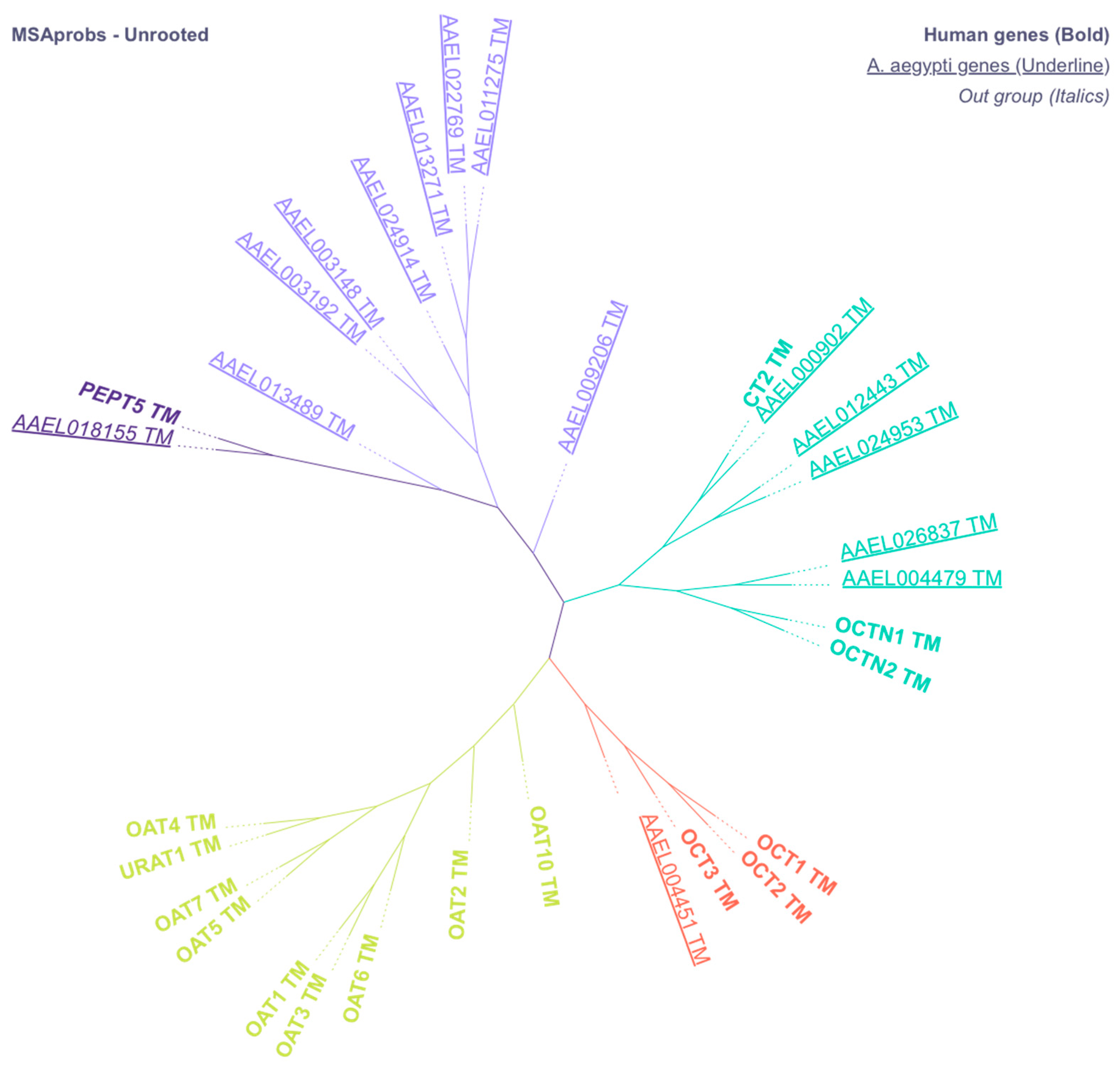 Figure 1. Unrooted phenogram of putative genes coding for mosquito OATs, OATPs, OCTs, and OCTNs (underlined text) aligned with human transporters (Bold text). All putative Ae. aegypti sequences and human sequences were analyzed for transmembrane regions and truncated to remove N- and C-termini. PEPT5 was used as a control in our analysis, and branch length was ignored.