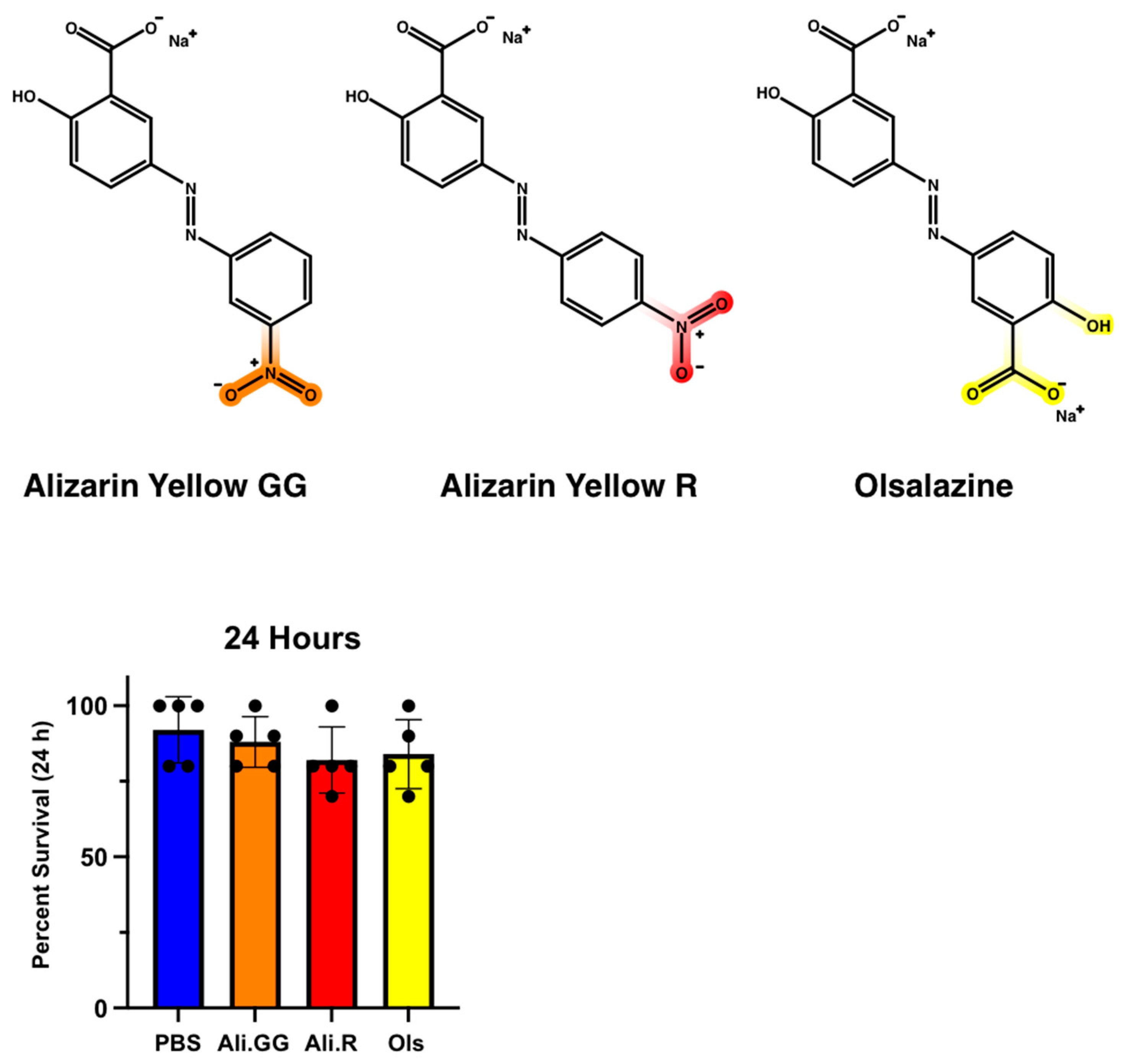 Figure 2. (Top): Structure of (left) Alizarin Yellow GG (NaC15H13N3O5), (center) Alizarin Yellow R (NaC13H9N3O5), and (right) Olsalazine (Na2C14H8N2O6) (PubChem). (Bottom): Percent survival of mosquitoes injected with PBS (control), Alizarin Yellow GG, Alizarin Yellow R, and Olsalazine at 24 h with a 100 nL injection. Dots represent a single trial of 10 mosquitoes. (n = 5 trials).
