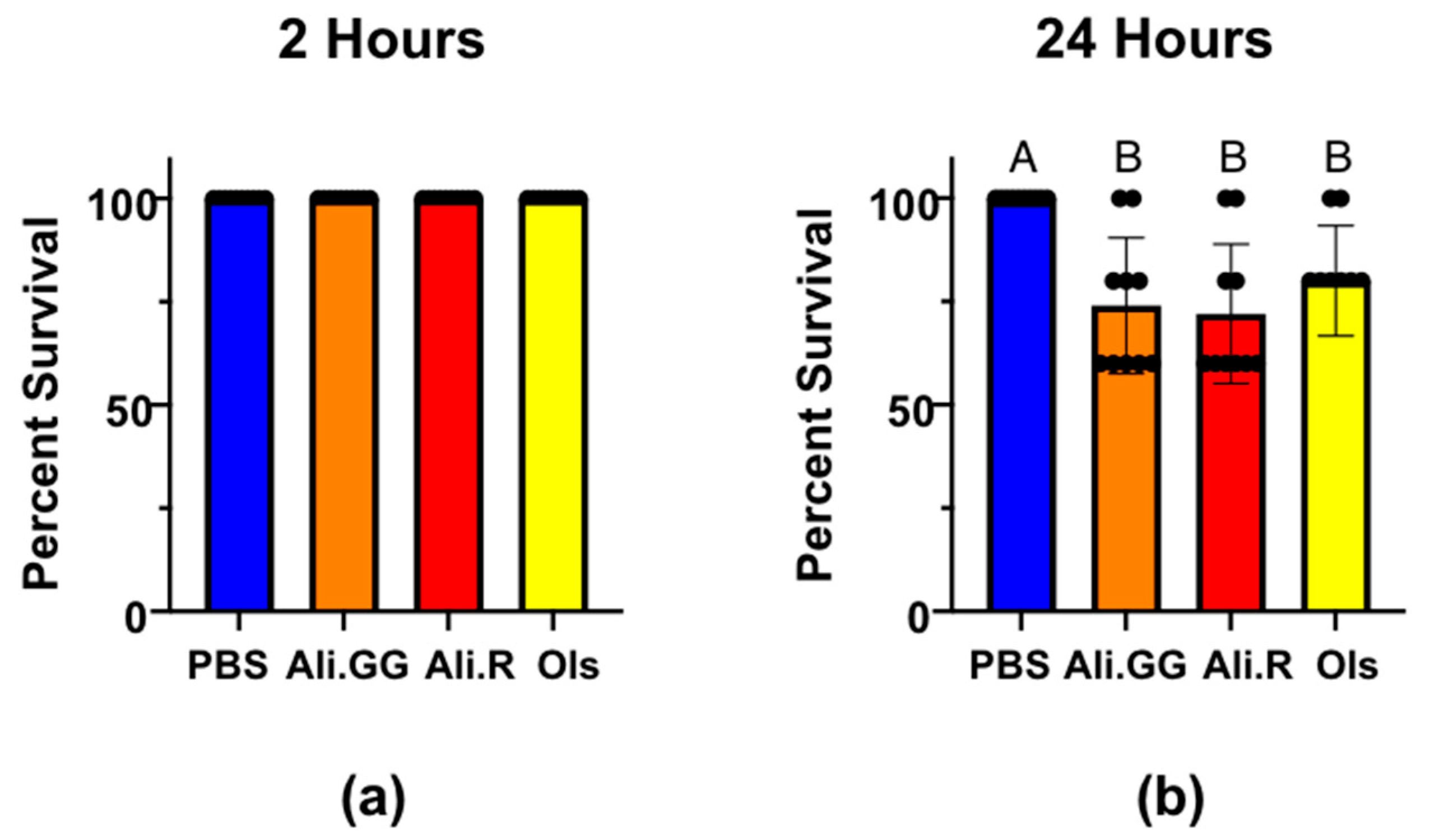 Figure 3. Percent survival of mosquitoes injected with PBS (control), Alizarin GG, Alizarin R, and Olsalazine at (a): 2 h with a 900 nL injection, and (b): 24 h with a 900 nL injection. Different letters over the bars indicate a significant difference at p < 0.05 (Tukey’s HSD). Dots represent a single trial of 10 mosquitoes (n = 10).