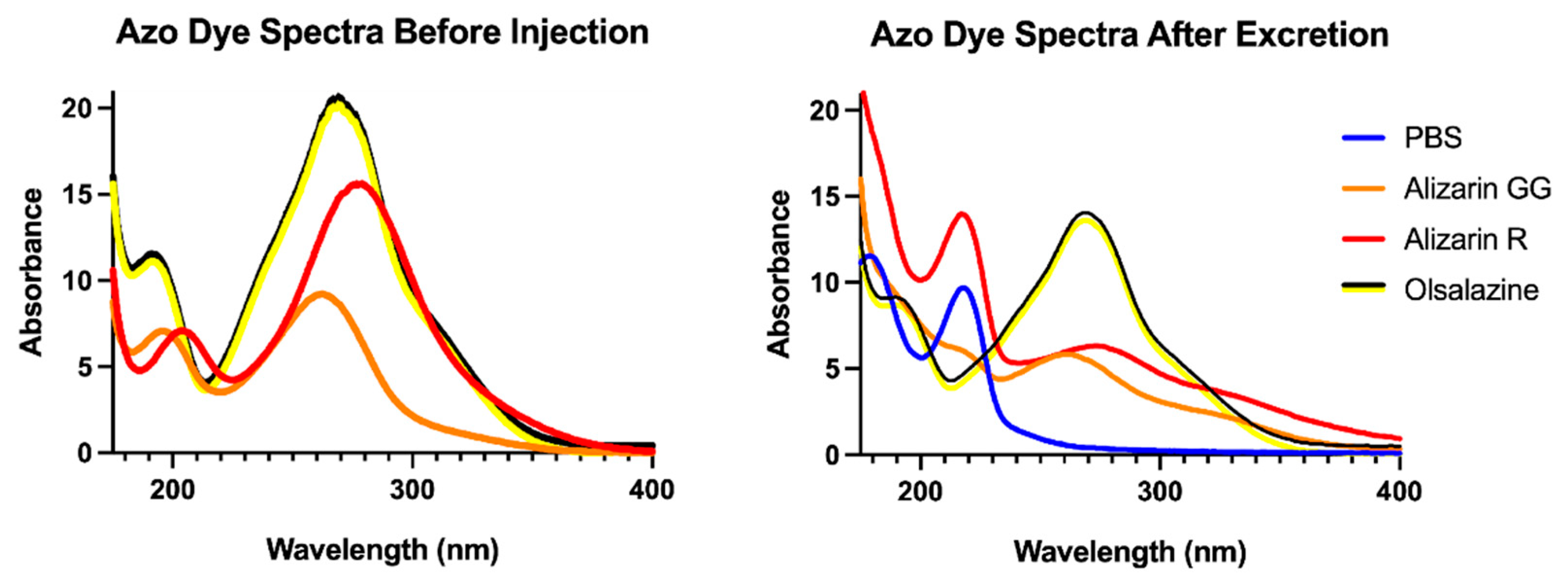 Figure 5. Absorbance spectra of Alizarin Yellow R, Alizarin Yellow GG, and Olsalazine before injection (left) and after excretion with PBS (right).