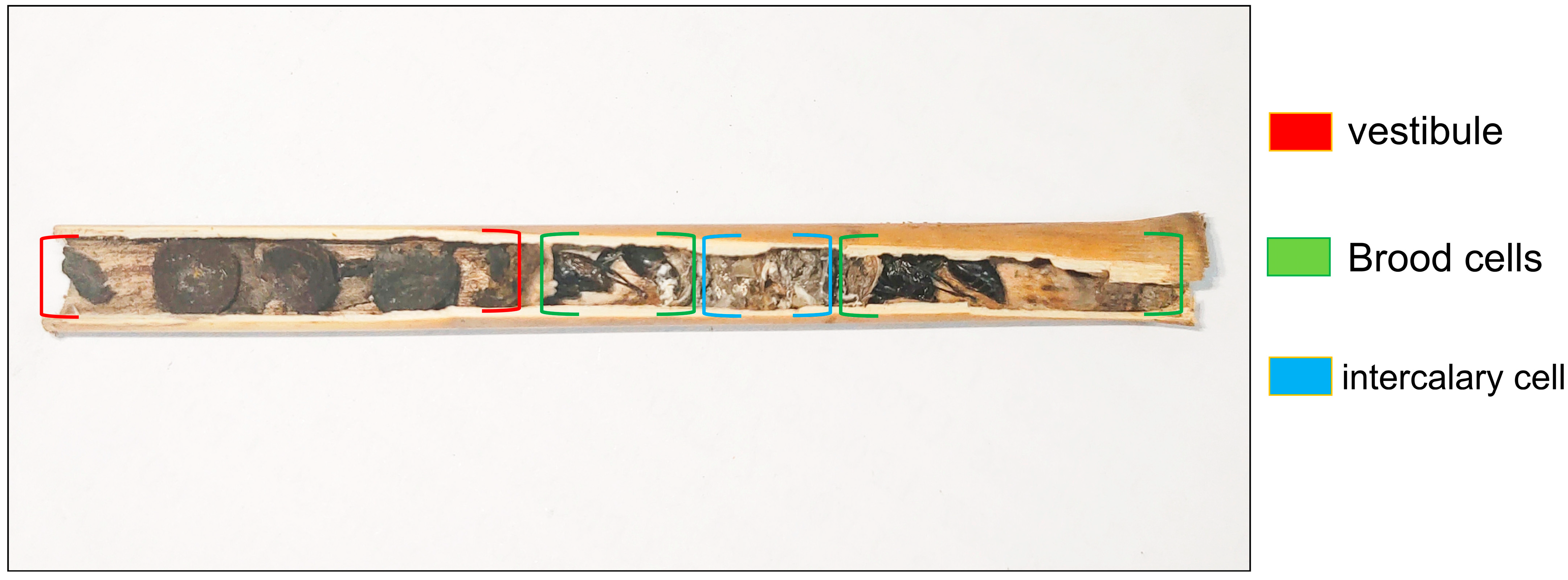 - Ronald, C.S.; Kevin, M.O.N.; Casey, M.D. Nesting Biology and Offspring Development of the Cavity-Nesting Solitary Wasp Isodontia elegans (F. Smith) from Trap-Nests in Oregon. West. North Am. Nat. 2021, 81, 558–570. [Google Scholar] [CrossRef]