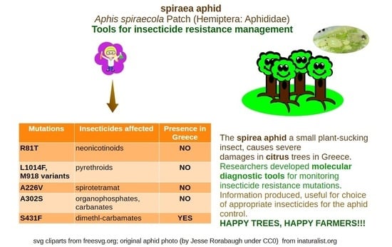 Ilias A, Skouras PJ, Kalaitzaki A, Roditakis E, Tsirikos E, Tsagkarakou A, Vontas J, Margaritopoulos JT. Survey and Molecular Diagnostics of Target Site Mutations Conferring Resistance to Insecticides in Populations of Aphis spiraecola from Greece. Insects. 2025; 16(12):1199. https://doi.org/10.3390/insects16121199