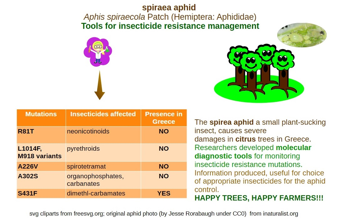 The spirea aphid, Aphis spiraecola, is a small insect that damages citrus trees and other crops by feeding on plant sap and spreading viruses. Farmers typically rely on insecticides to manage this pest; however, excessive use can result in the development of resistance, thereby reducing the effectiveness of control measures. In this study, we collected aphids from citrus orchards across Greece and tested them for genetic changes already known to confer insecticide resistance in related species. We found that Greek populations do not yet carry mutations conferring resistance to most common insecticides, such as neonicotinoids, pyrethroids, organophosphates, and spirotetramat. However, one mutation (S431F), which can reduce the effectiveness of dimethy-carbamate insecticides, such as pirimicarb, was detected at high frequency. This suggests that pirimicarb, a selective aphidicide, although not registered for citrus in Greece, may no longer be a reliable option in cases of emergency use or in resistance management programs. We also developed simple and cost-effective diagnostic tools that can quickly identify resistance mutations in field samples. These tools may enable farmers and advisors to monitor aphid populations more effectively and support sustainable pest control strategies in citrus production.